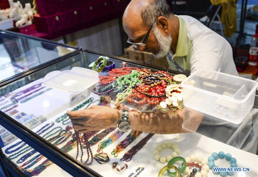 An exhibitor displays exhibits during the Second Northeast Asia Cultural and Art Fair in Harbin, capital of northeast China's Heilongjiang Province, July 17, 2019. (Xinhua/Xie Jianfei)