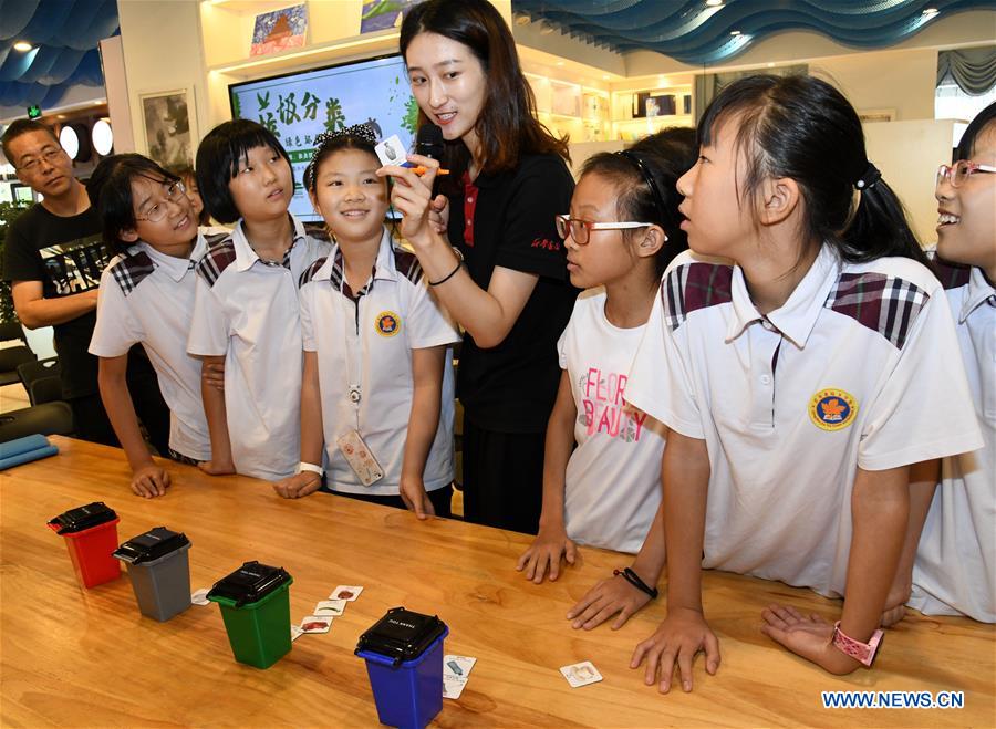 A teacher gives students a test for the waste classification during a summer vacation course at a bookstore in Qingdao, east China's Shandong Province, Aug. 24, 2019. Various activities on the waste classification are held during a summer vacation course at a bookstore to raise students' awareness of the issue in Qingdao. (Xinhua/Li Ziheng)