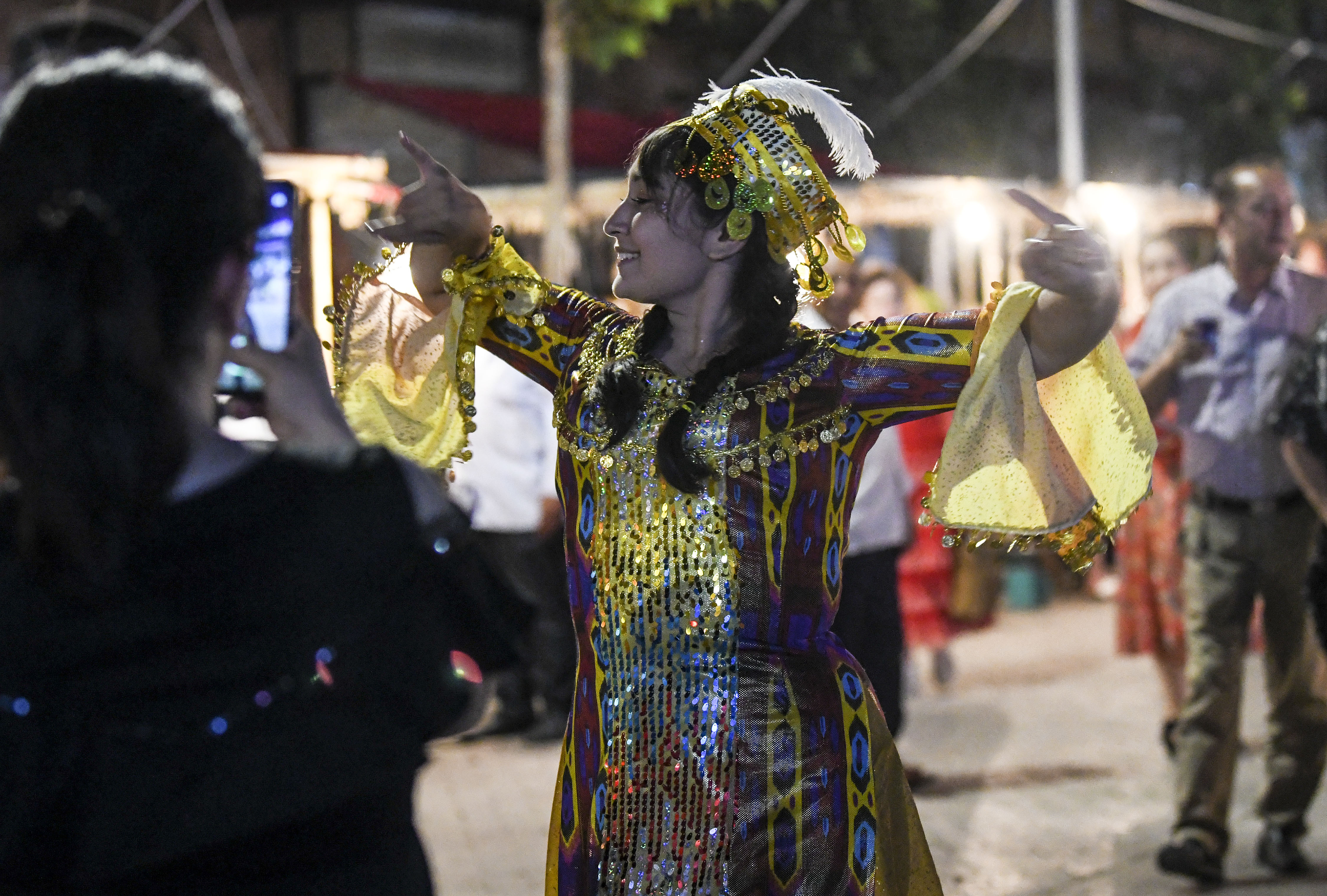 A girl dressed in ethnic costumes dances at a night fair in Kashgar, northwest China's Xinjiang Uygur Autonomous Region, Aug. 12, 2019. (Xinhua/Wang Fei)