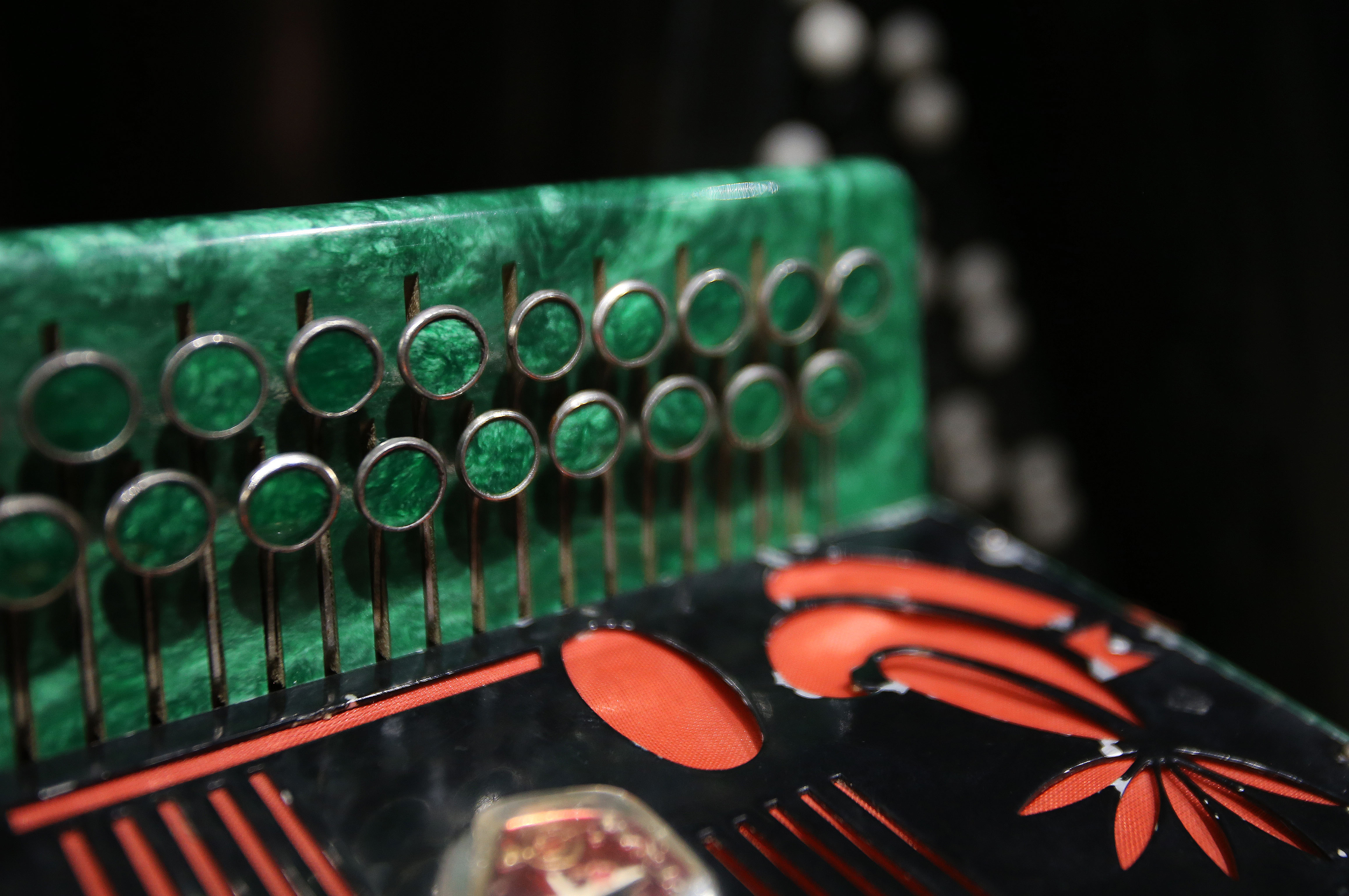 Photo taken on Sept. 4, 2019 shows detail of an accordion displayed at the Tacheng accordion museum. (Xinhua/An Xiya)