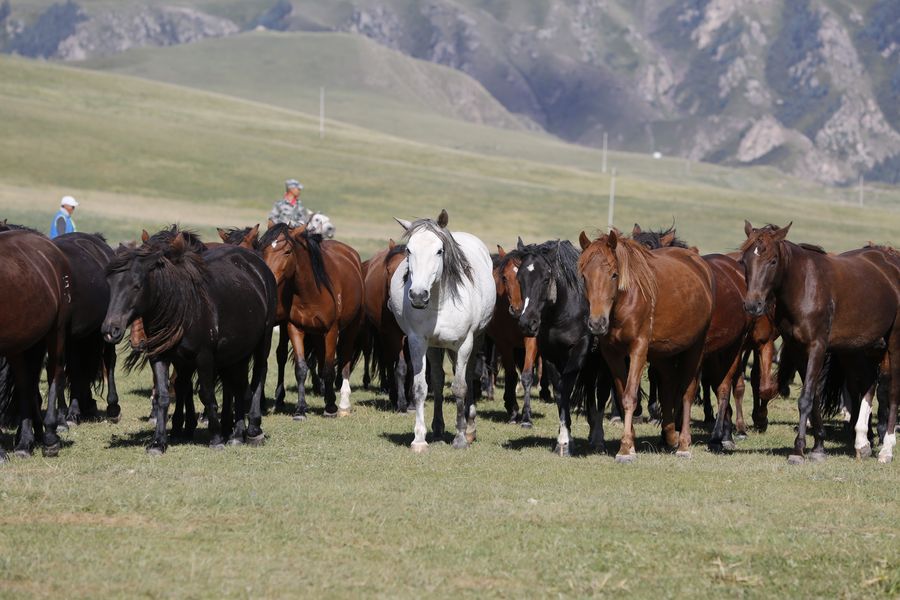 Photo taken on Sept. 10, 2019 shows herdsmen and horses at Shandan horse ranch in Shandan County of Zhangye City, northwest China's Gansu Province.(Photo by Du Zheyu/Xinhua)