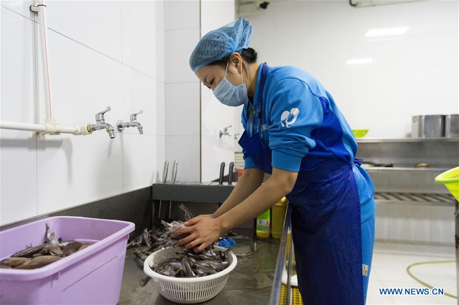 Zang Mingyue prepares breakfast for beluga whale at the Harbin Polarland in Harbin, capital of northeast China's Heilongjiang Province, Sept. 29, 2019. Zang Mingyue decided to become a trainer of beluga whale after she was touched by a performance of the marine mammal when she was guiding a tourist group. She resigned in 2012 when she was 23 years old, and turned to work at the Harbin Polarland as a trainer. She overcame a series of difficulties and strives to be the best at her work. She feels that she loves beluga whale more deeply as she knows more about it. (Photo by Xie Jianfei/Xinhua)