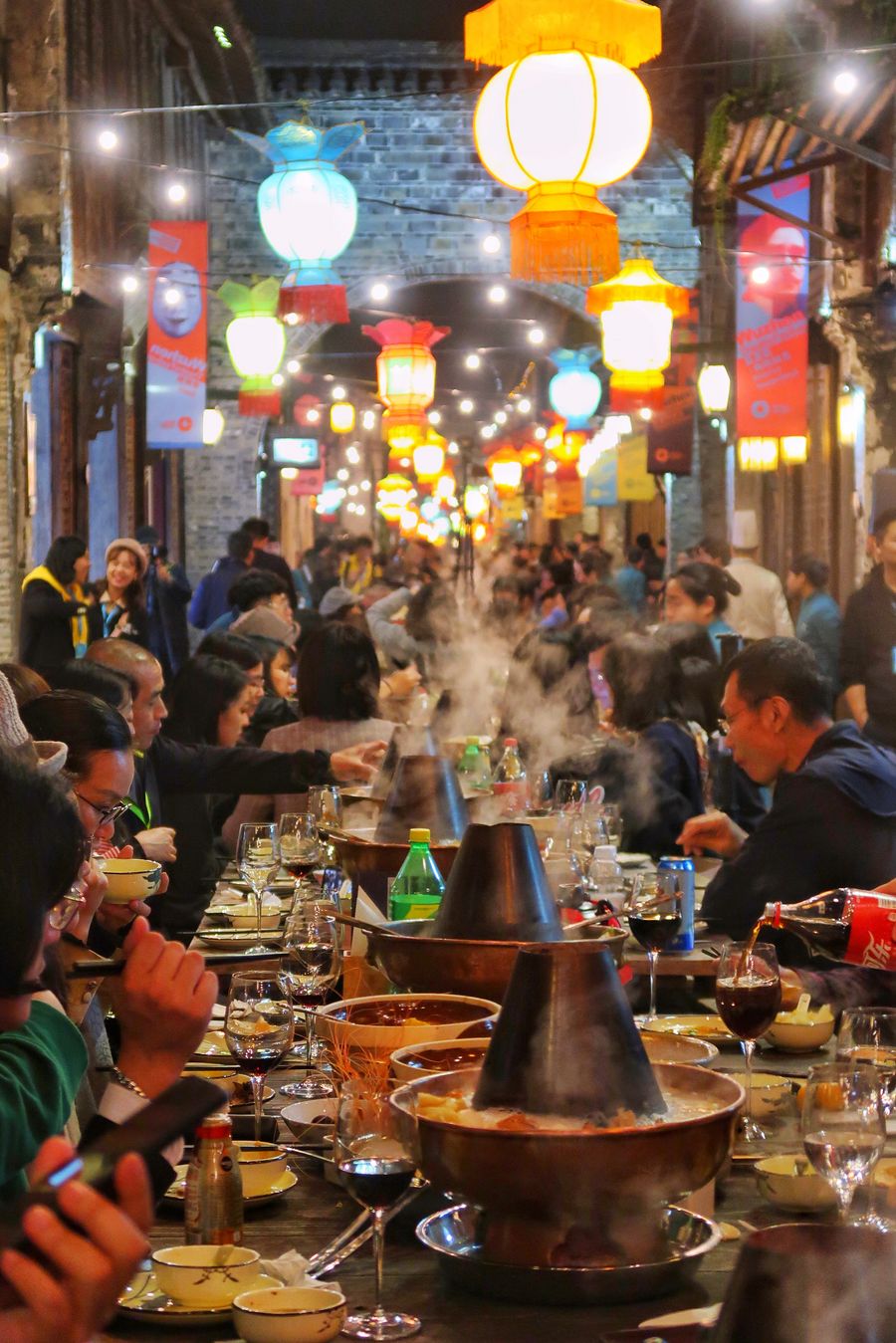 Steaming hotpots take pride of place on long-tables set out for a street banquet held during the 7th Wuzhen Theatre Festival in Wuzhen, east China's Zhejiang Province, Oct. 28, 2019. (Xinhua/Zheng Mengyu)