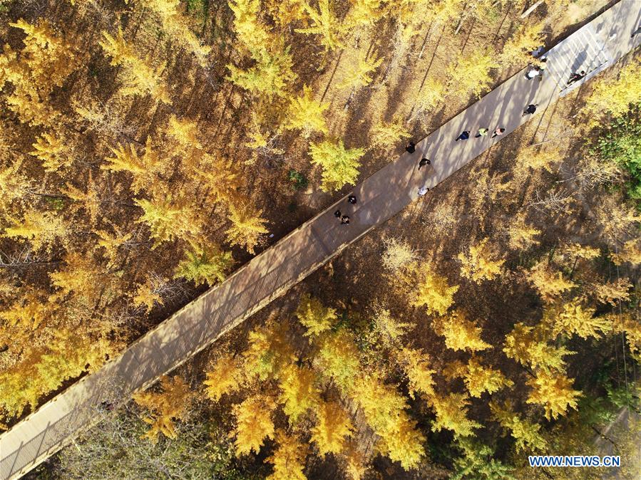 Aerial photo taken on Oct. 31, 2019 shows ginkgo trees in Luanxie Village of Shahe City, north China's Hebei Province. The Taihang mountains attract lots of visitors as the leaves change colors in autumn. (Xinhua/Xing Guangli)