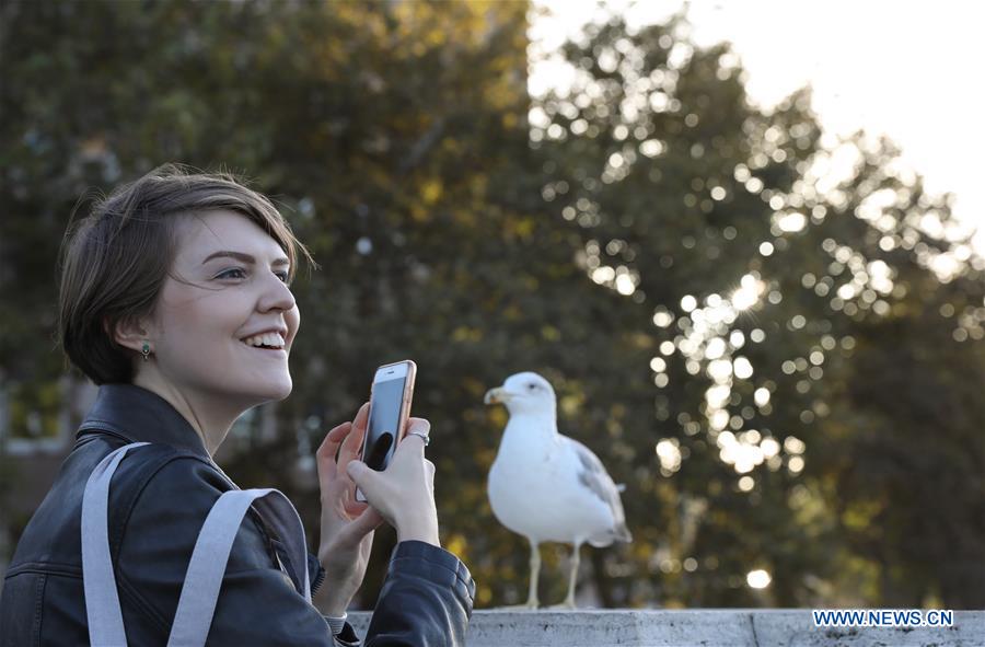 A woman takes pictures of a seagull on the Ponte Sant'Angelo in Rome, Italy, on Nov. 4, 2019. (Xinhua/Cheng Tingting)