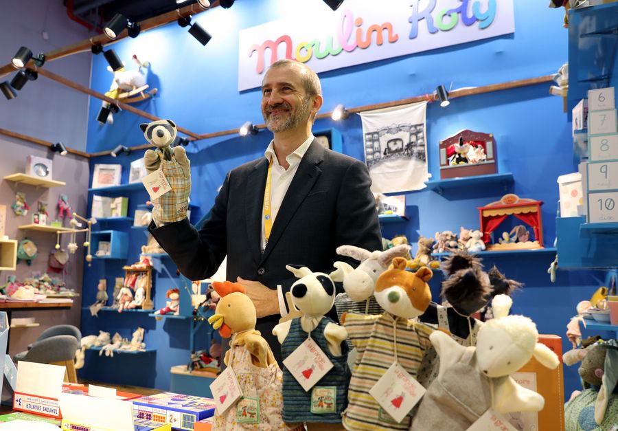 An exhibitor from France shows a toy at the Lifestyles exhibition area during the second China International Import Expo (CIIE) in Shanghai, east China, Nov. 5, 2019. The second CIIE kicked off Tuesday at the National Exhibition and Convention Center in Shanghai. (Xinhua/Liu Ying)