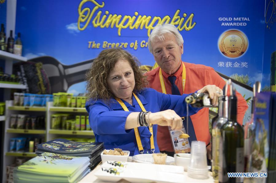 Greek exhibitors work during the second China International Import Expo (CIIE) in Shanghai, east China, Nov. 7, 2019. Greece is one of the guest countries of honor at the second CIIE. It leads a business delegation of 68 companies representing the most dynamic sectors of the Greek economy here. (Xinhua/Purbu Zhaxi)