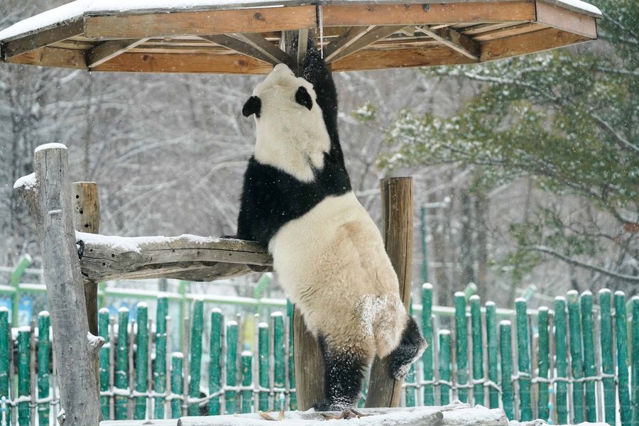 Amazed by the snowfall, Giant panda Sijia found herself a naughty baby cub again at the age of 13 years old.