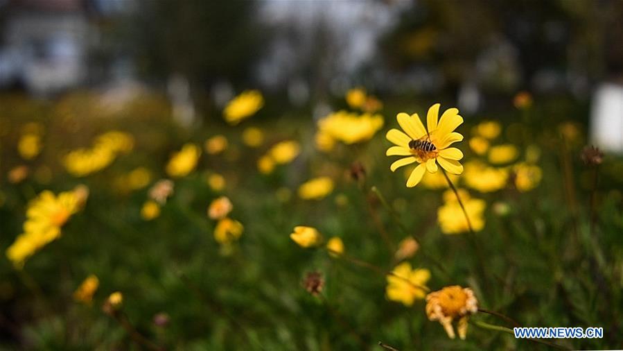 A bee collects honey among flowers at the Heishijing scenic spot in Shilin Yi Autonomous County, southwest China's Yunnan Province, Nov. 28, 2019. With about one thousand kinds of Chinese medicines growing among the rocks, the Heishijing scenic spot attracts many visitors with its special landscape. (Xinhua/Zhang Ailin)