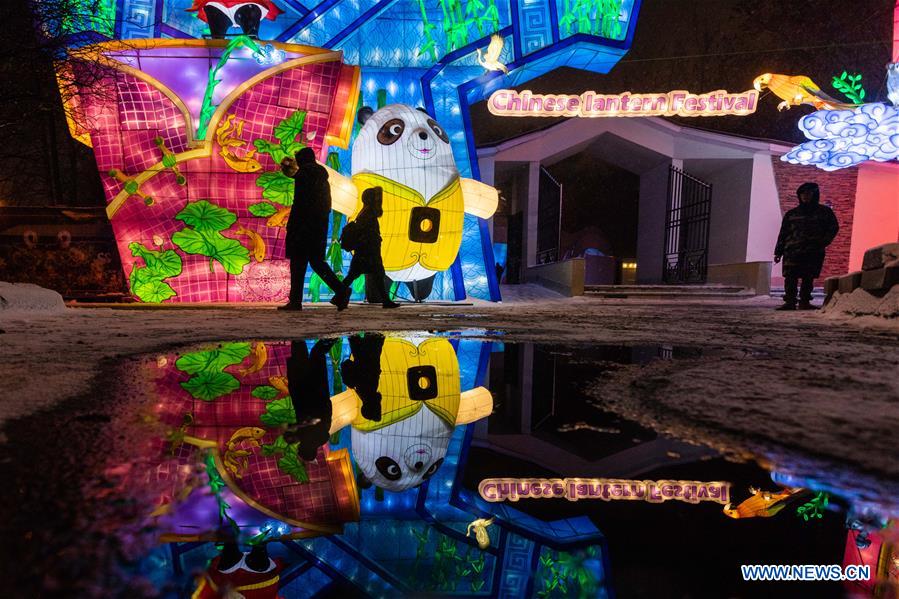People walk past exhibits during a festival of Chinese lanterns at a park in Moscow, Russia, Dec. 4, 2019. The festival kicked off Wednesday with some 4,500 lanterns made by artists from Zigong, a city in southwest China's Sichuan Province which is famous for lantern-making. (Xinhua/Bai Xueqi)