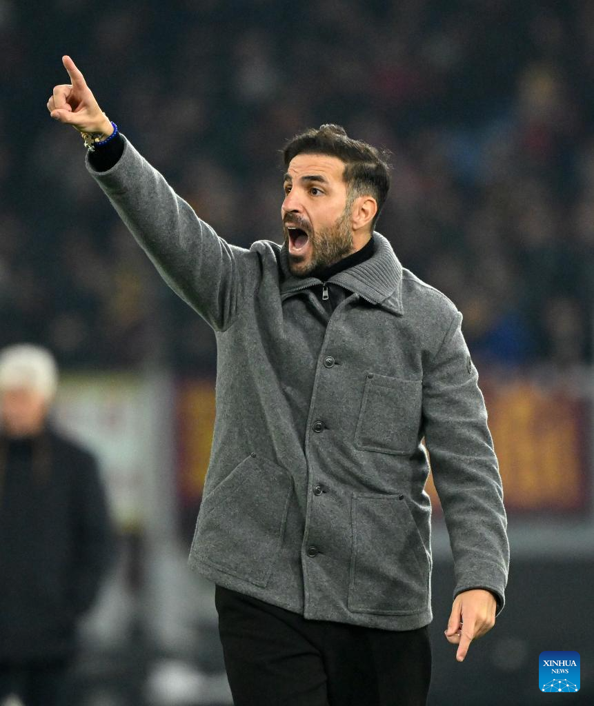 Como's head coach Cesc Fabregas gestures during a Serie A football match between Roma and Como in Rome, Italy, Dec.15, 2025. (Photo by Alberto Lingria/Xinhua)
