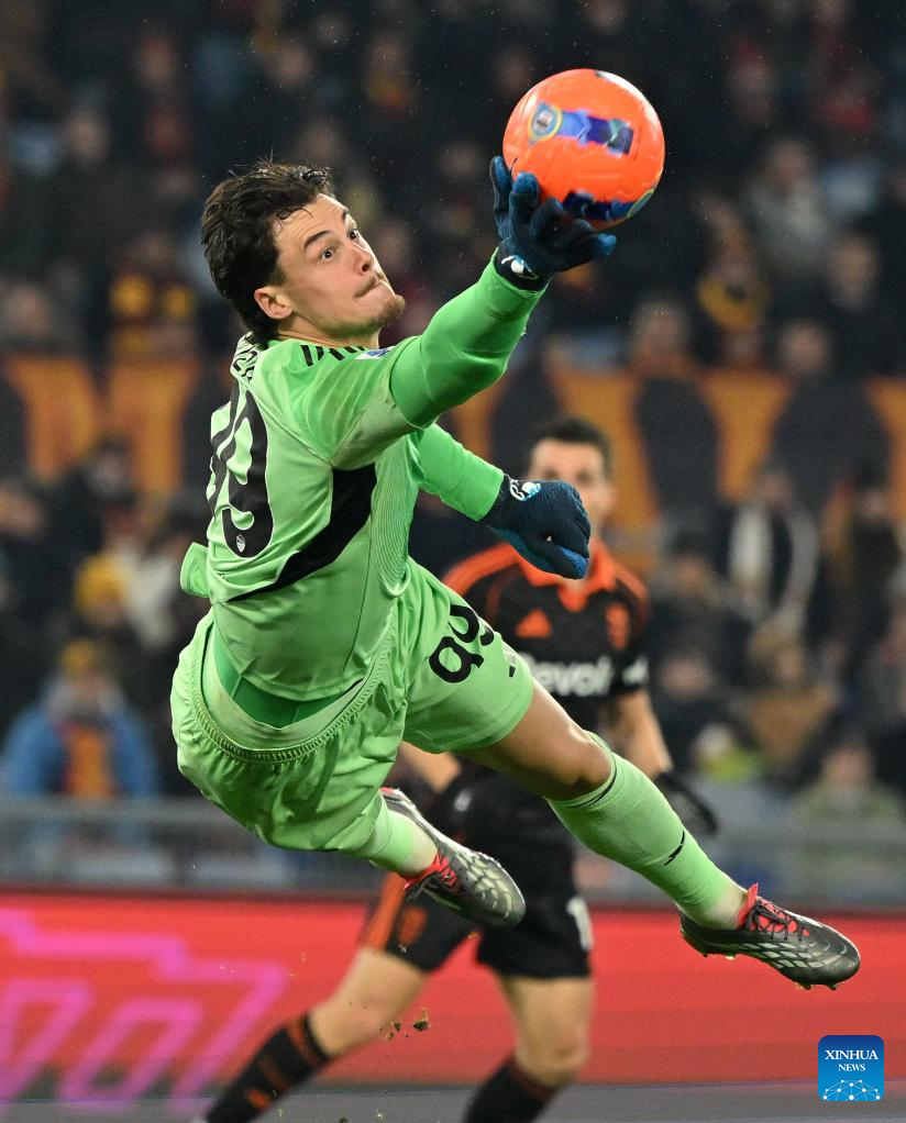 Roma's goalkeeper Mile Svilar makes a save during a Serie A football match between Roma and Como in Rome, Italy, Dec.15, 2025. (Photo by Alberto Lingria/Xinhua)