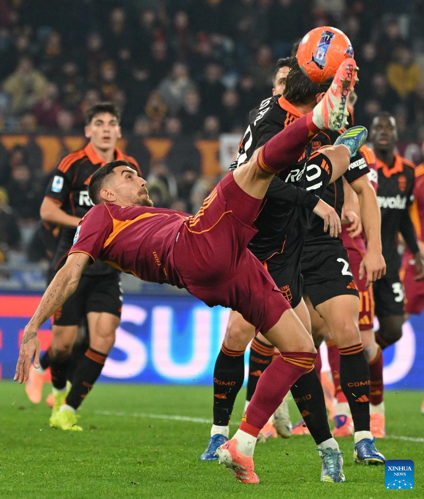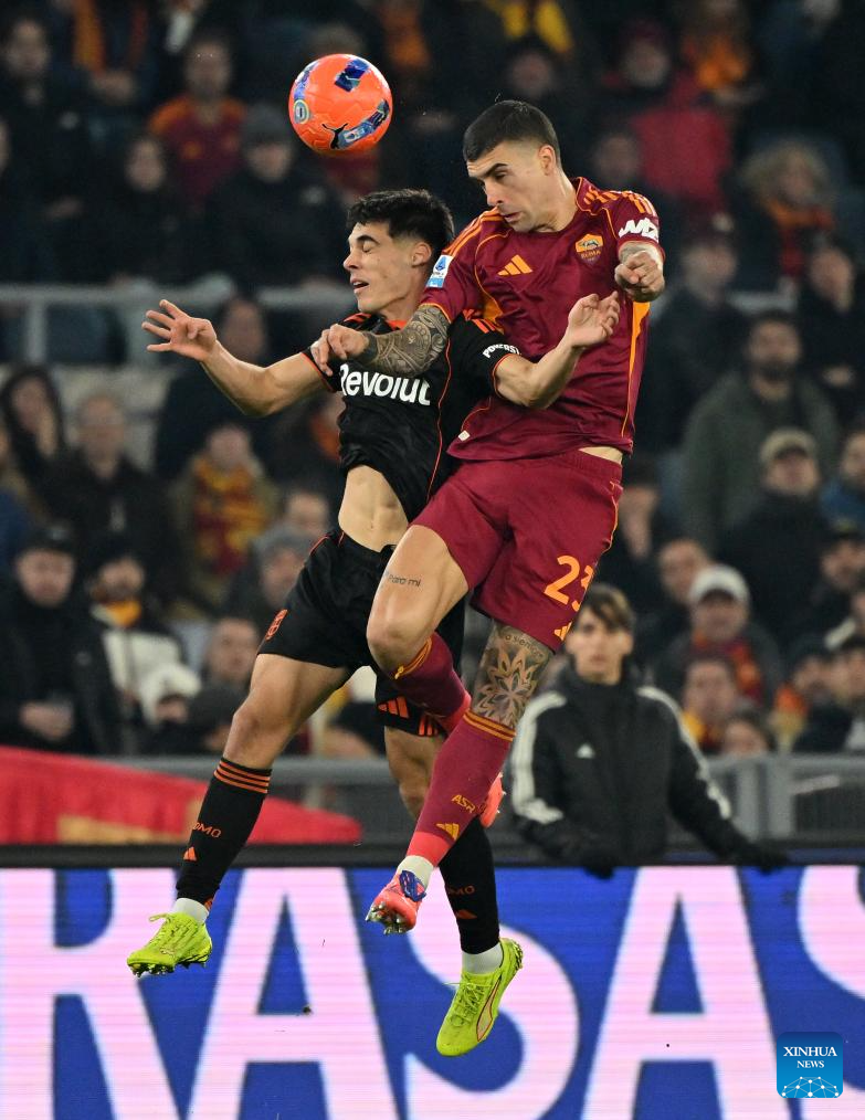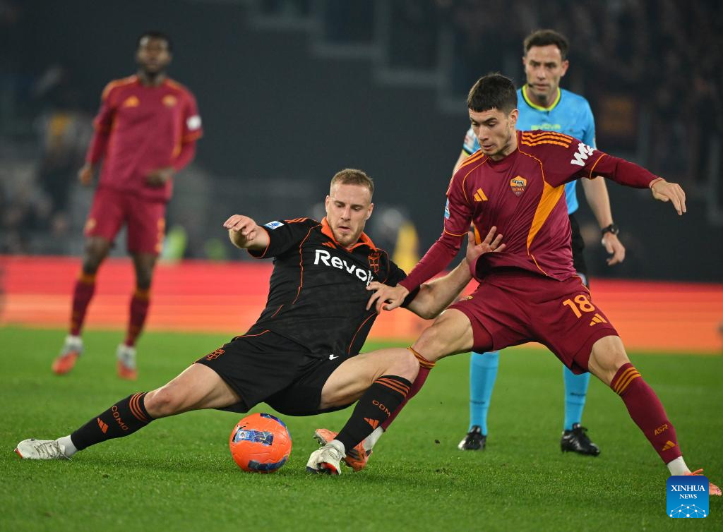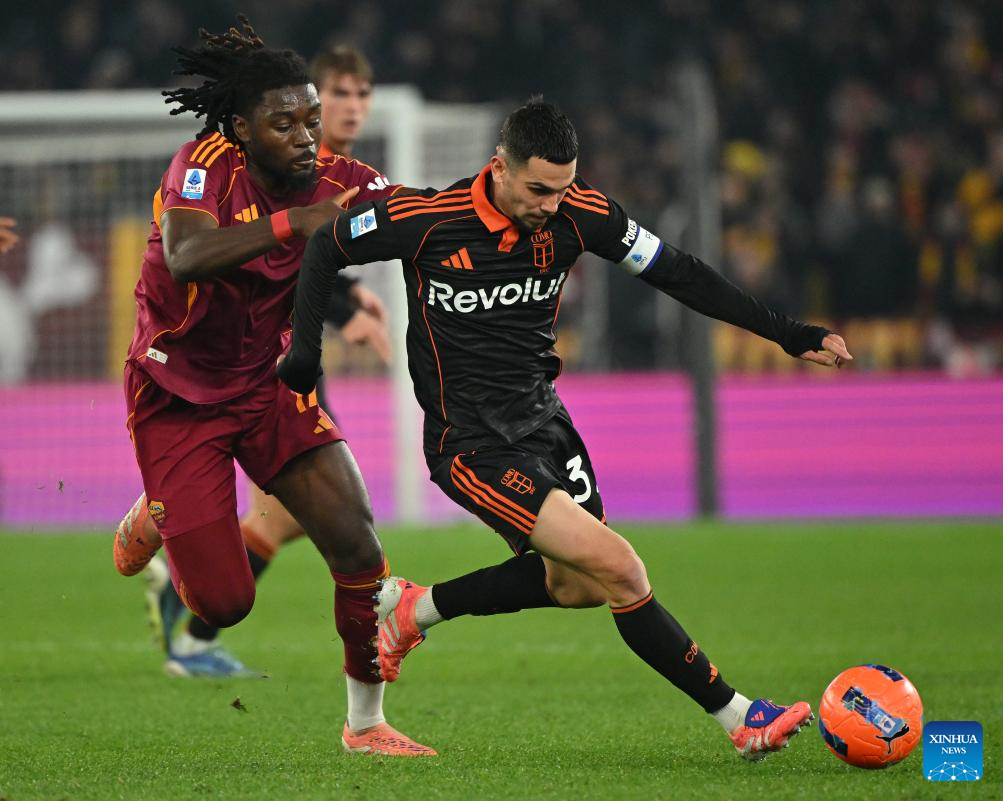 Roma's Matias Soule (R) vies with Como's Ivan Smolcic during a Serie A football match between Roma and Como in Rome, Italy, Dec.15, 2025. (Photo by Alberto Lingria/Xinhua)