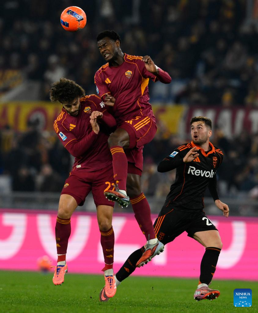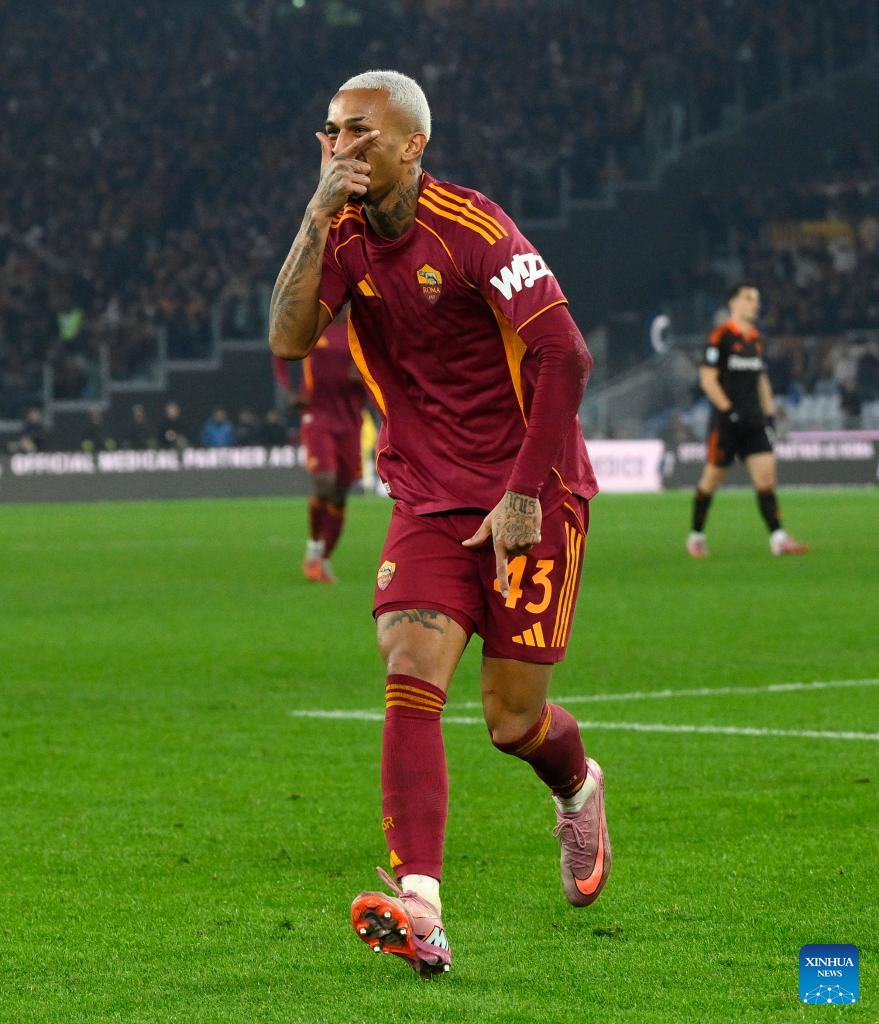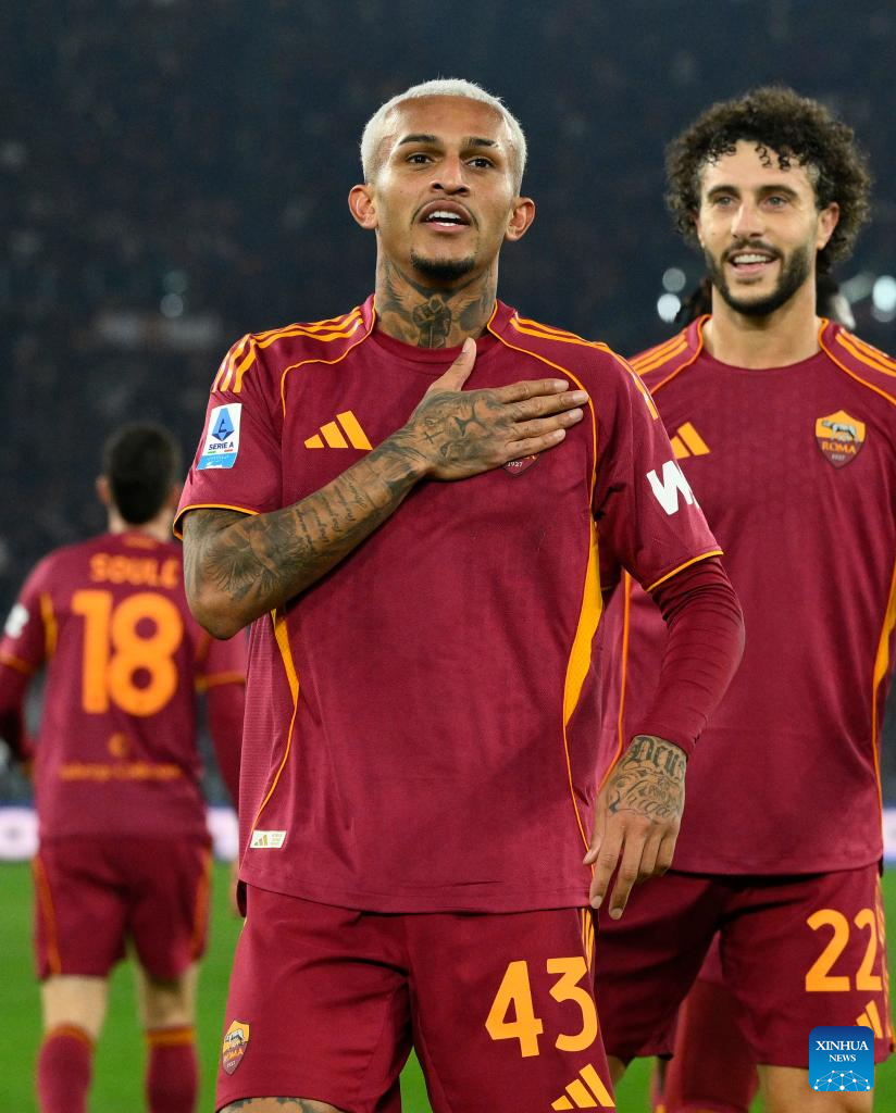 Roma's Wesley Franca (front) celebrates his goal during a Serie A football match between Roma and Como in Rome, Italy, Dec.15, 2025. (Photo by Alberto Lingria/Xinhua)