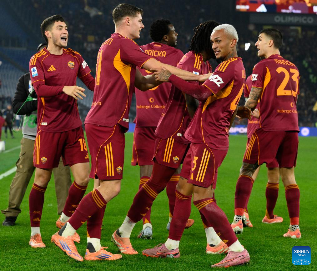 Roma's Wesley Franca (2nd R) celebrates his goal with teammates during a Serie A football match between Roma and Como in Rome, Italy, Dec.15, 2025. (Photo by Alberto Lingria/Xinhua)