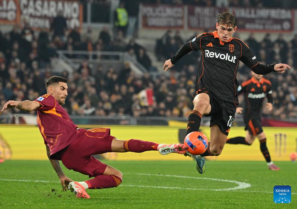 Roma's Lorenzo Pellegrini (L) vies with Como's Nico Paz during a Serie A football match between Roma and Como in Rome, Italy, Dec.15, 2025. (Photo by Alberto Lingria/Xinhua)