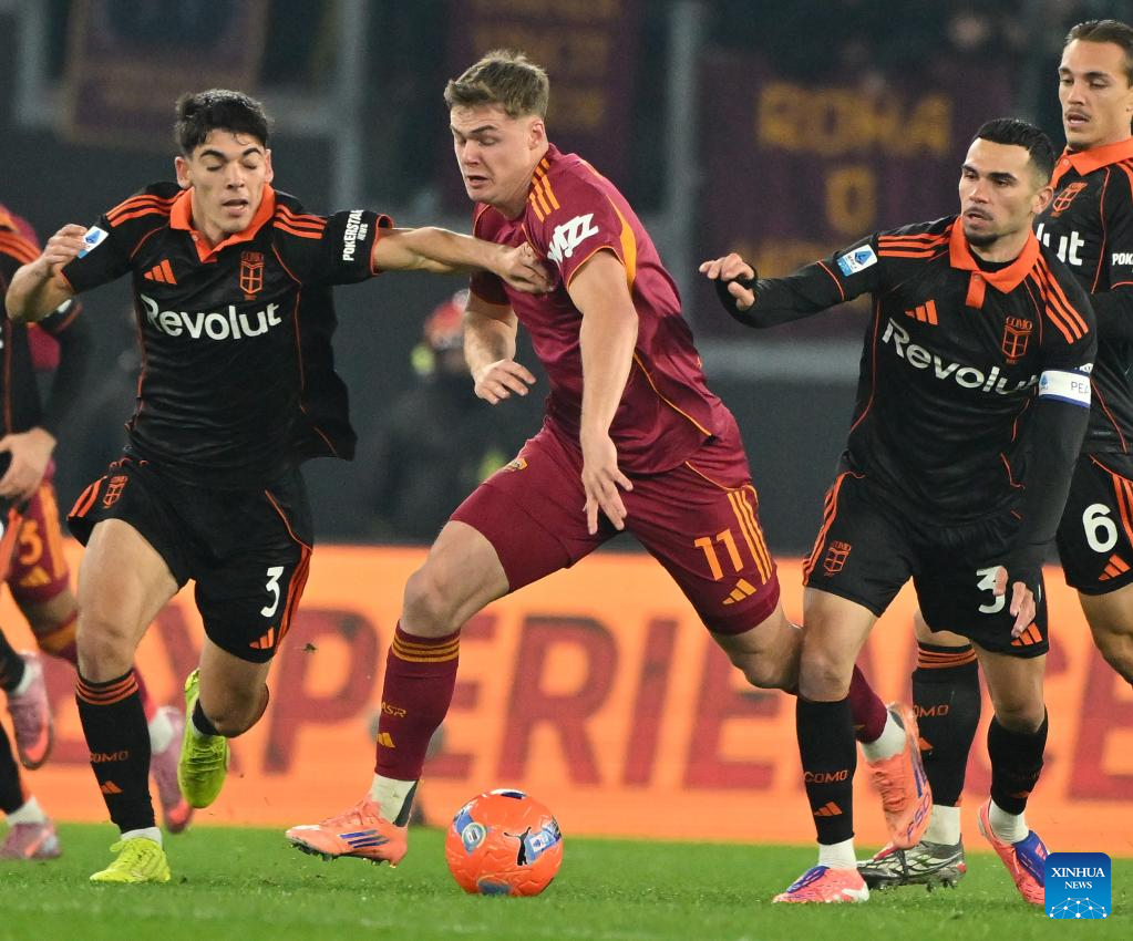 Roma's Evan Ferguson (2nd L) vies with Como's Alex Valle (1st L) and Lucas Da Cunha (2nd R) during a Serie A football match between Roma and Como in Rome, Italy, Dec.15, 2025. (Photo by Alberto Lingria/Xinhua)