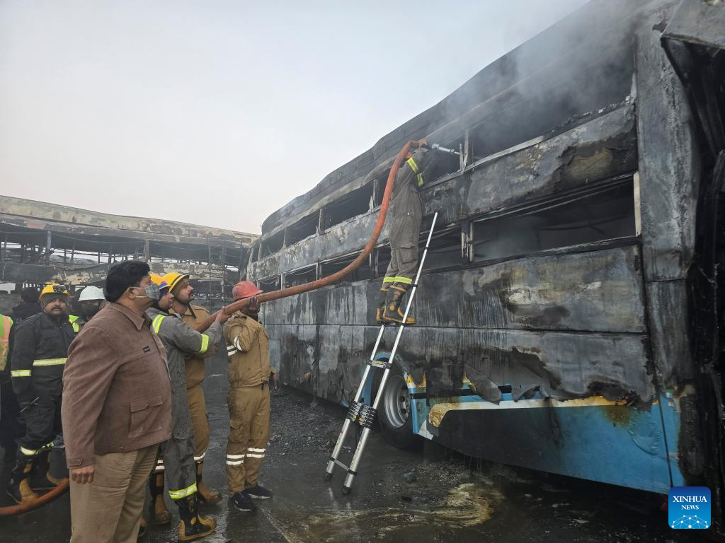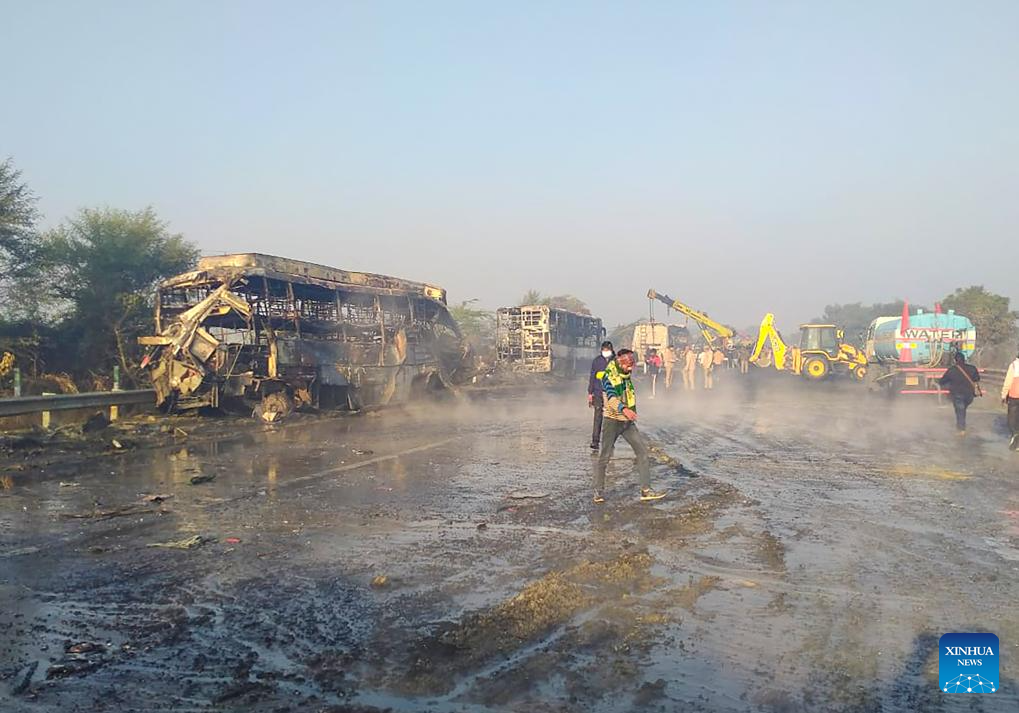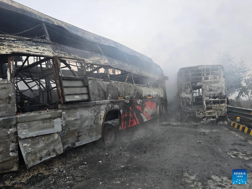 Wreckage of buses are seen after a multi-vehicle collision on the Delhi-Agra Expressway in Mathura district of India's northern state of Uttar Pradesh, Dec. 16, 2025. The death toll from Tuesday's multi-vehicle collision has risen to 15, with around 48 people injured, local police confirmed by phone. Up to seven buses and three cars were involved in the pileup amid heavy fog. The collision immediately caused the vehicles to catch fire, resulting in numerous casualties. (Str/Xinhua)
