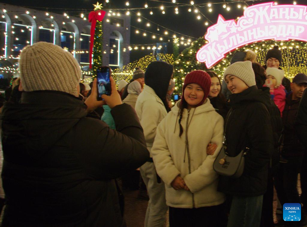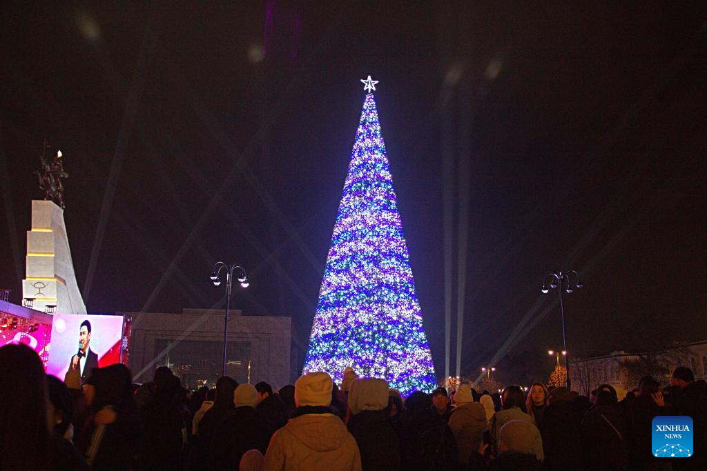 People attend the New Year tree lighting ceremony in Bishkek, Kyrgyzstan, Dec. 15, 2025. (Xinhua/Jiang Youlin)