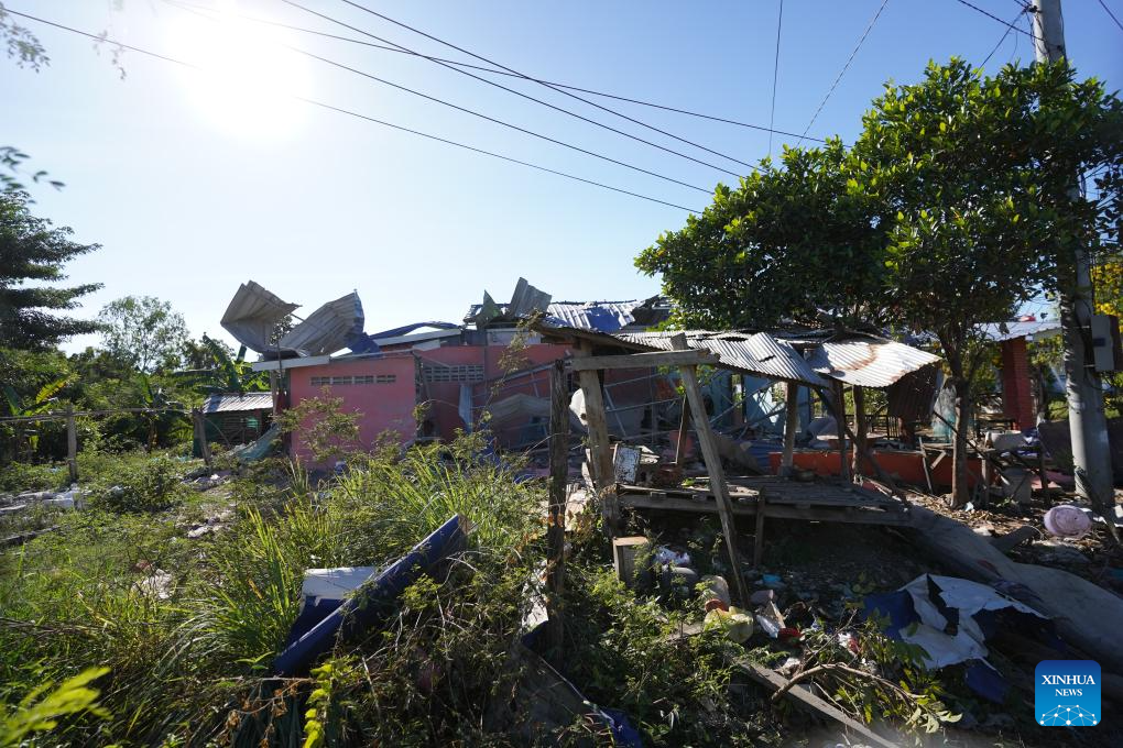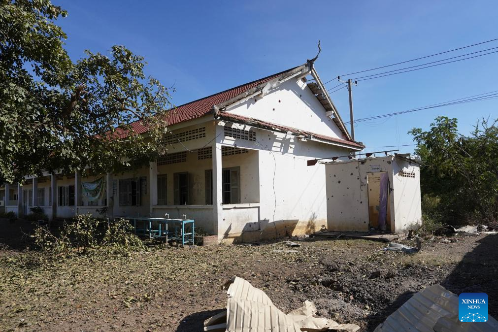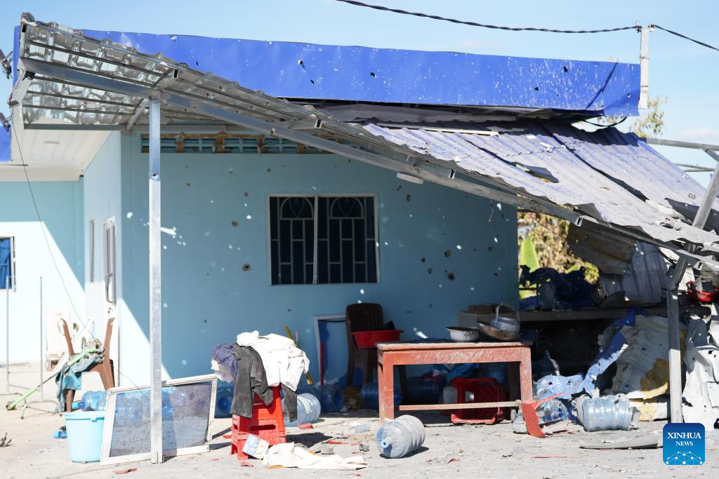 A civilian house damaged by shrapnel of artillery shells fired by Thai military forces is seen in Banteay Meanchey province, Cambodia, Dec. 16, 2025. The Thai military forces have continued to fire artillery shells at many locations in Cambodian territory from Monday midnight until Tuesday morning, said a Cambodian defense spokesperson on Tuesday. Cambodian Defense Ministry's Undersecretary of State and Spokesperson Lt. Gen. Maly Socheata made the remarks in a press briefing. On the same day, Cambodia's Interior Ministry said in a press release that the civilian death toll in Cambodia has increased to 15. (Agence Kampuchea Presse/Handout via Xinhua)