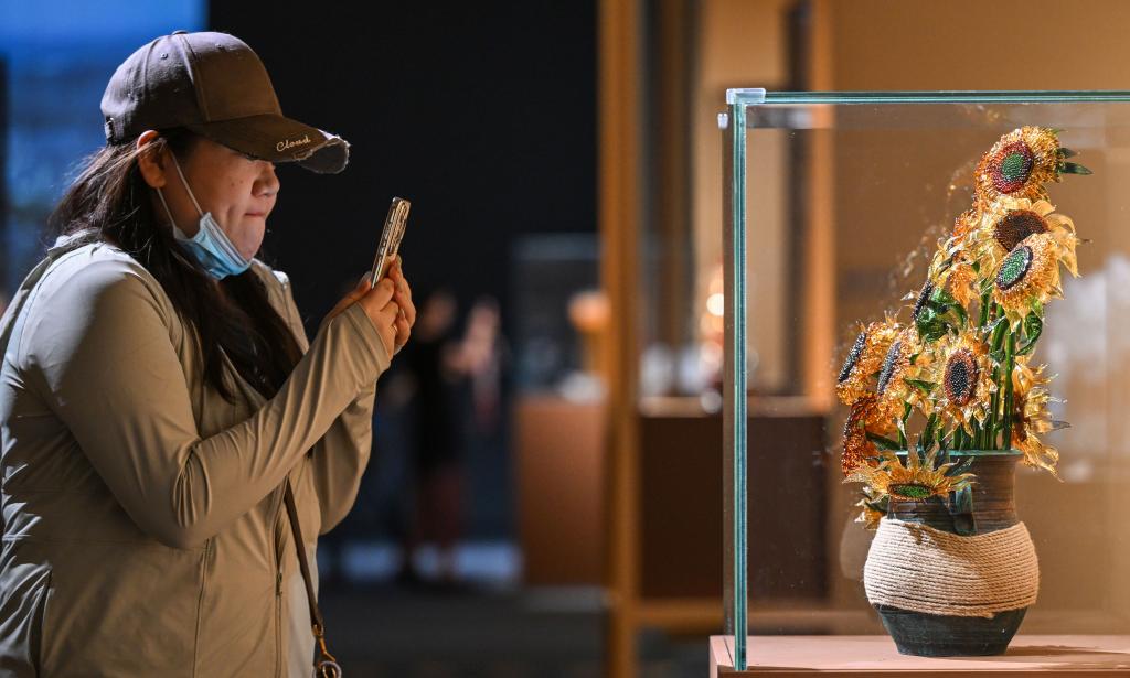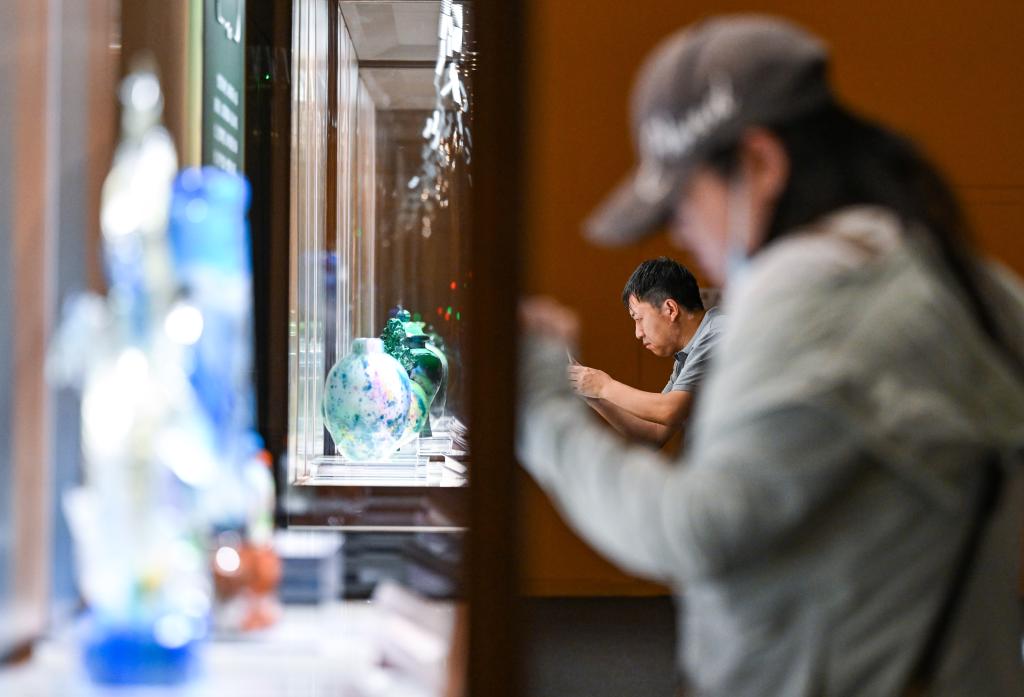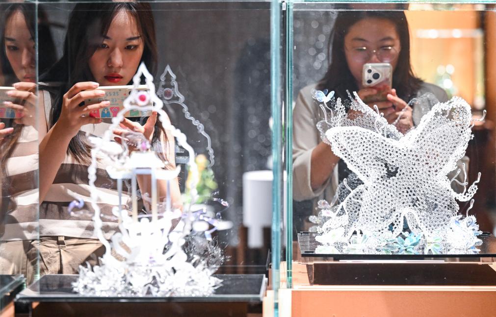 6月10日,参观者在拍摄一件名为“暖光里的葵语”的参展琉璃作品。
