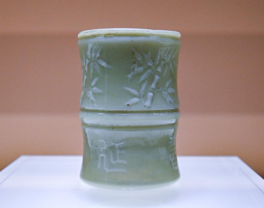 这是展出的淄博陶瓷琉璃博物馆藏清代青色琉璃笔筒(6月10日摄)。
