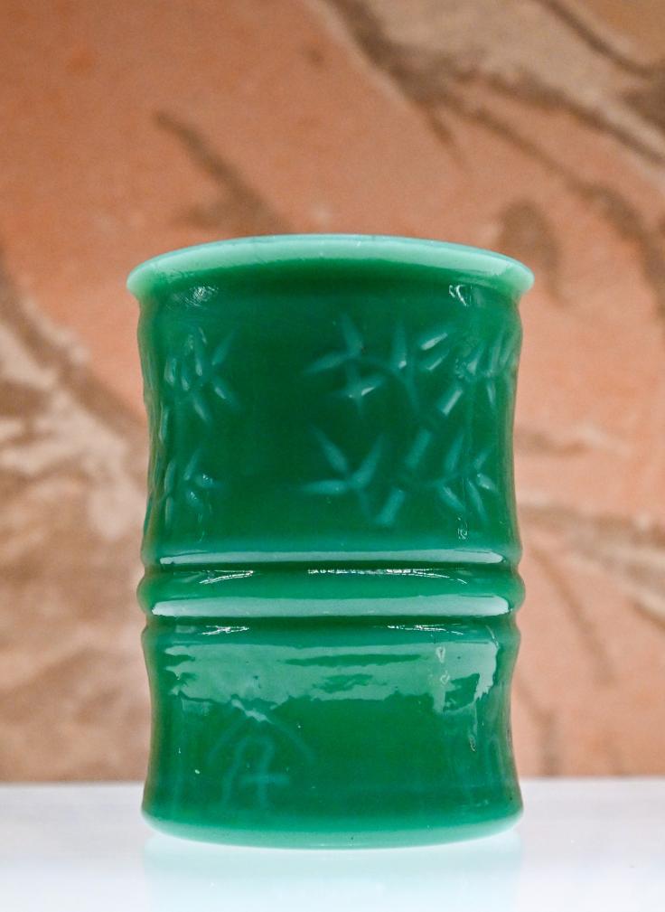这是展出的淄博陶瓷琉璃博物馆藏清代碧色琉璃笔筒(6月10日摄)。