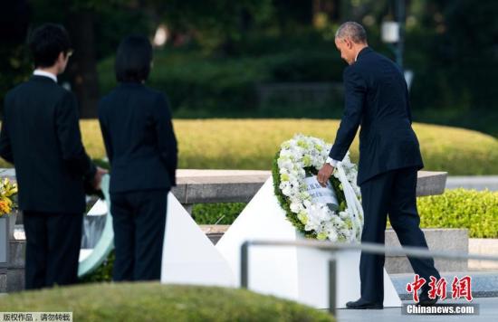 ????資料圖:2016年5月27日,美國(guó)總統(tǒng)奧巴馬乘直升機(jī)抵達(dá)日本廣島和平紀(jì)念公園附近,展開(kāi)對(duì)和平紀(jì)念公園的訪問(wèn)并獻(xiàn)上花環(huán)。