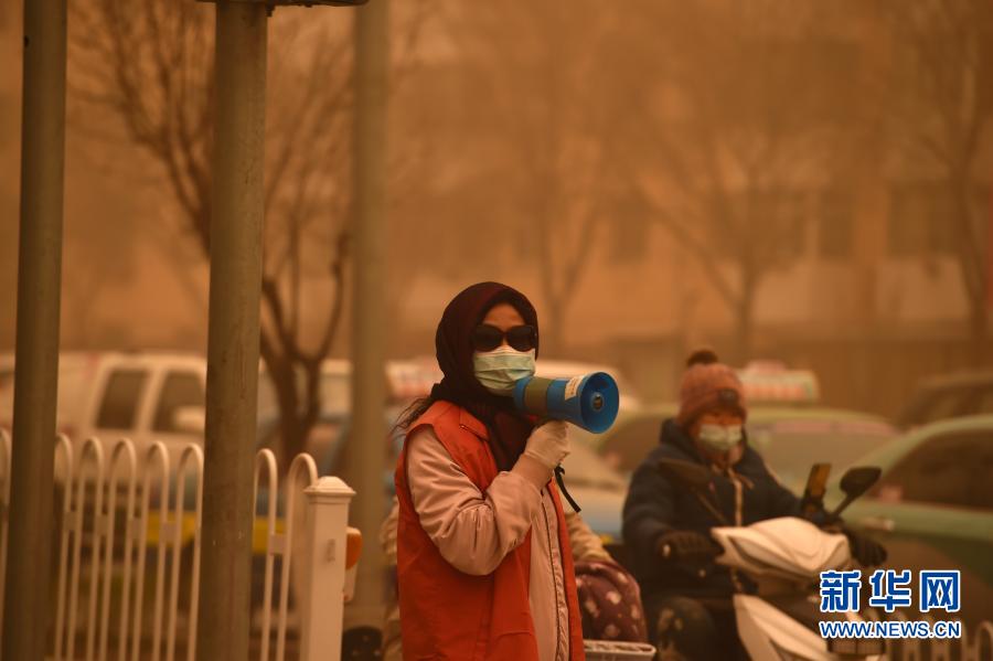 3月15日,在寧夏銀川市,志愿者在沙塵中引導(dǎo)市民出行。當(dāng)日,我國北方多地出現(xiàn)沙塵天氣。新華社記者 唐如峰 攝
