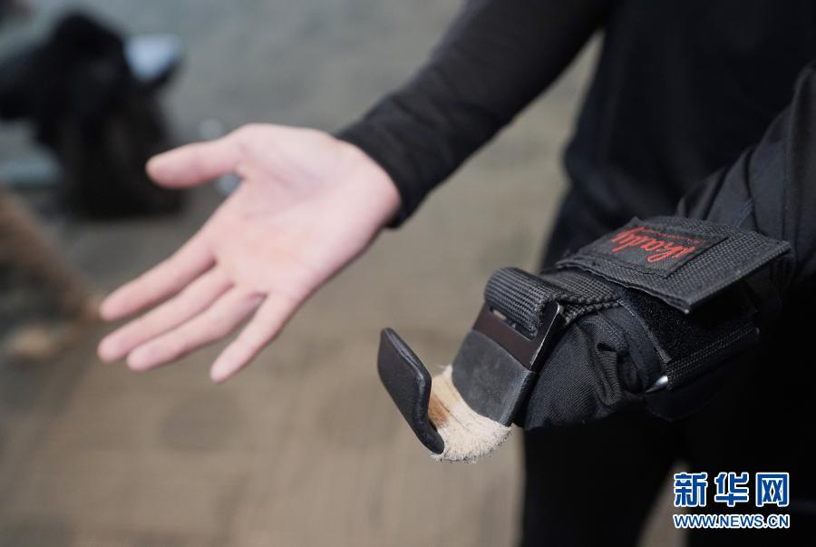 3月19日,冬殘奧會國家集訓(xùn)隊(duì)單板滑雪運(yùn)動員紀(jì)立家在運(yùn)動員駐地進(jìn)行體能訓(xùn)練時展示他穿戴的俗名“鉤子”的輔助器械。新華社記者 才揚(yáng) 攝