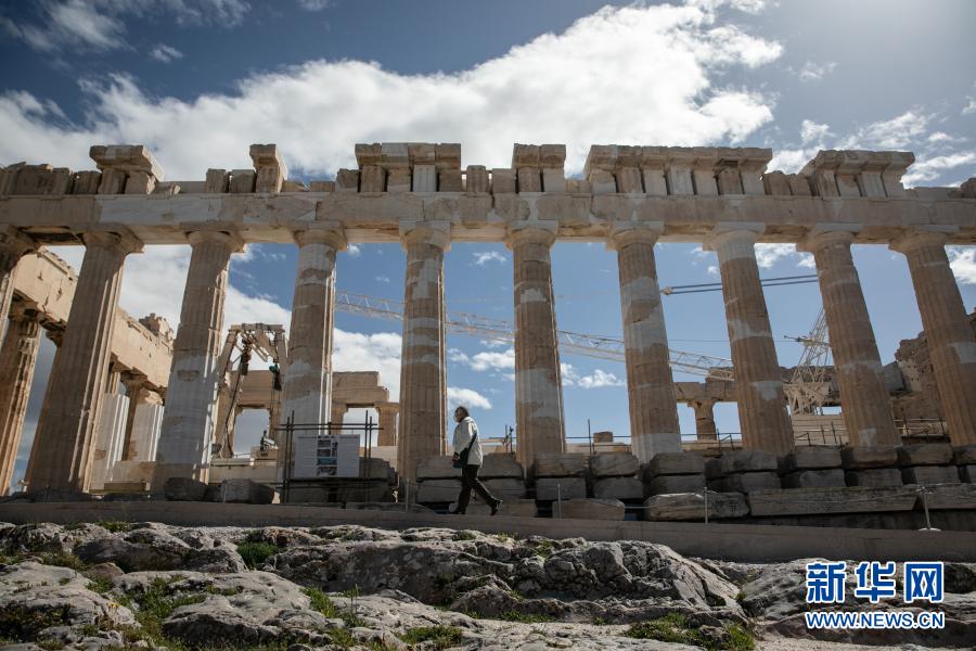 3月22日,一名游客游覽希臘雅典衛(wèi)城。希臘露天考古遺跡22日起恢復開放。游客需遵守保持社交距離和佩戴口罩等防疫規(guī)定。新華社發(fā)(萊夫特里斯·帕察里斯攝)