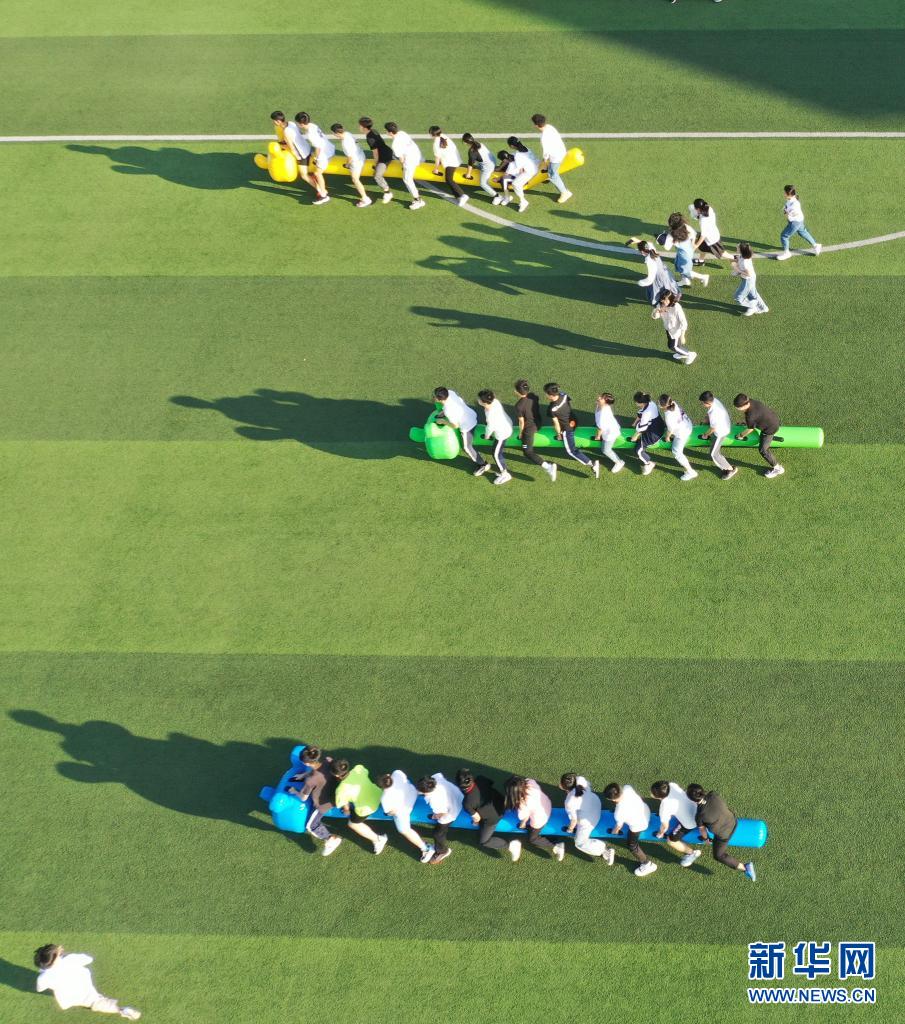 5月25日,湖南省永州市道縣第一中學(xué)的高三學(xué)生在做“同舟共濟(jì)”游戲(無人機(jī)照片)。
