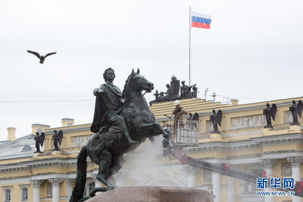 5月26日,工作人員在俄羅斯圣彼得堡清潔“青銅騎士”雕像。