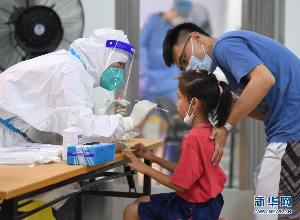 5月26日,在廣州荔灣體育館核酸檢測點(diǎn),小朋友在家人的陪伴下進(jìn)行核酸檢測采樣。新華社記者 鄧華 攝