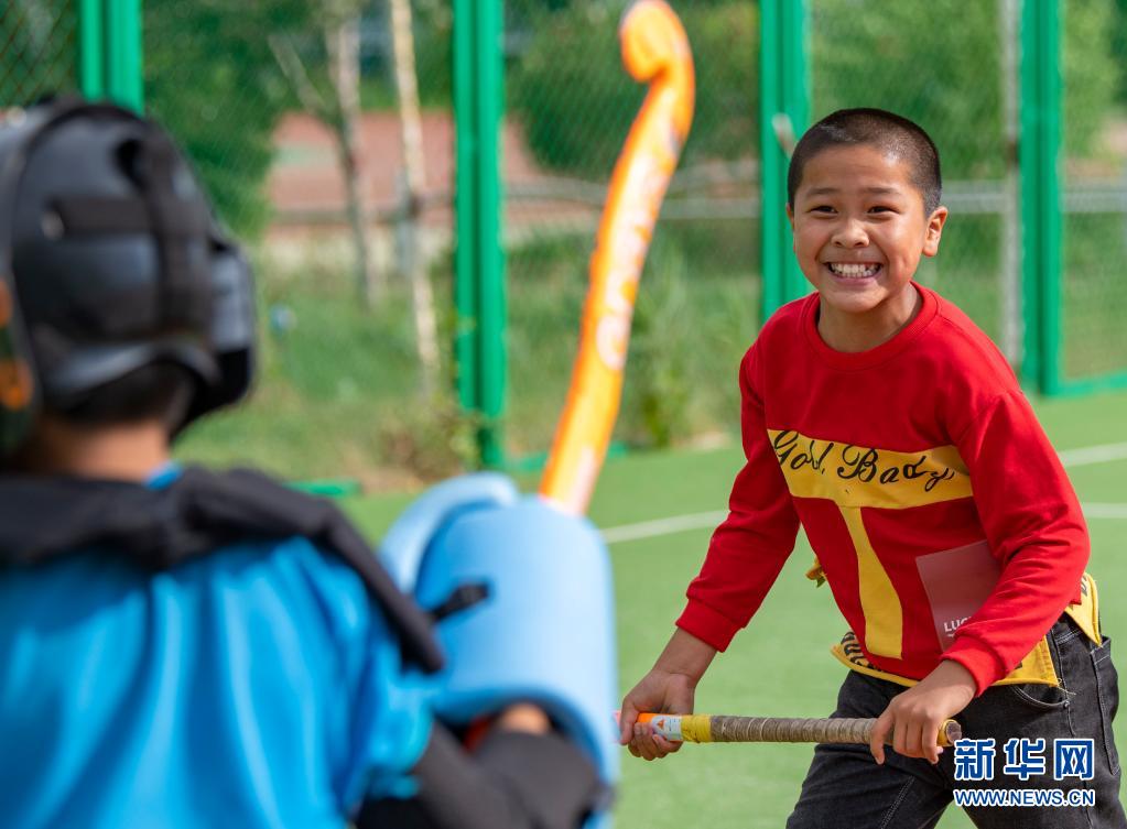 塔城市第二小學曲棍球隊的小隊員馬子豪(右)在訓練中(6月11日攝)。