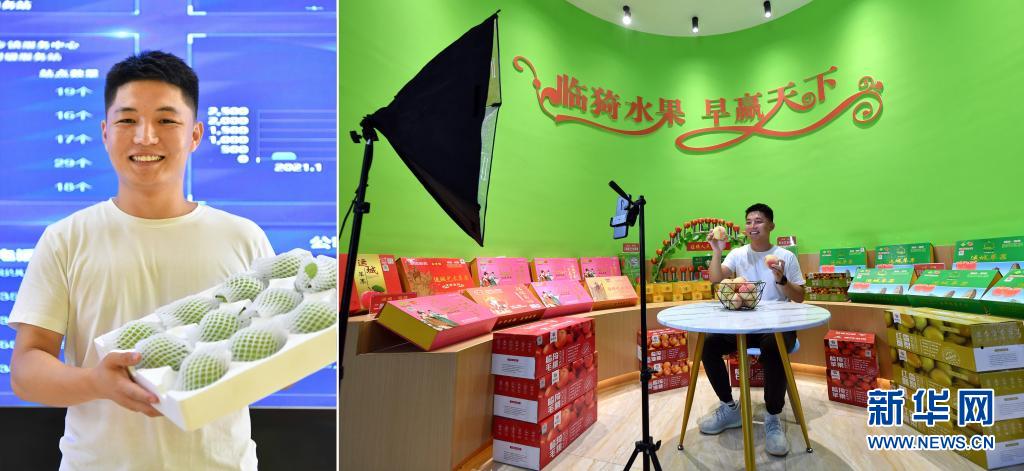 拼版照片:左圖為董晨旭展示山西省臨猗縣產(chǎn)的梨;右圖為董晨旭通過網(wǎng)絡(luò)直播介紹當(dāng)?shù)禺a(chǎn)的桃(7月13日攝)。今年22歲的董晨旭是臨猗縣北景鄉(xiāng)張村人,他年紀(jì)不大,卻有著豐富的開店經(jīng)驗(yàn)。為了幫助鄉(xiāng)親們?cè)诰W(wǎng)上銷售水果,他于2020年3月開始在電商平臺(tái)創(chuàng)業(yè),店鋪在旺季達(dá)到一天一萬余箱的銷售量,讓他對(duì)農(nóng)村電商發(fā)展充滿了信心。