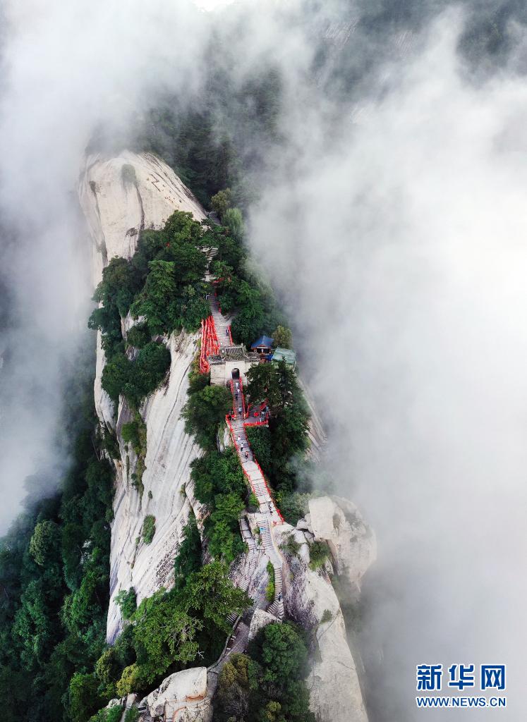 8月14日,云霧中的西岳華山金鎖關(guān)(無(wú)人機(jī)照片)。