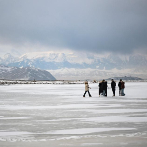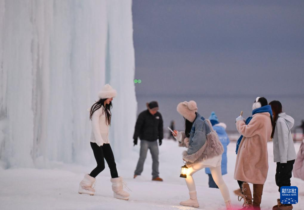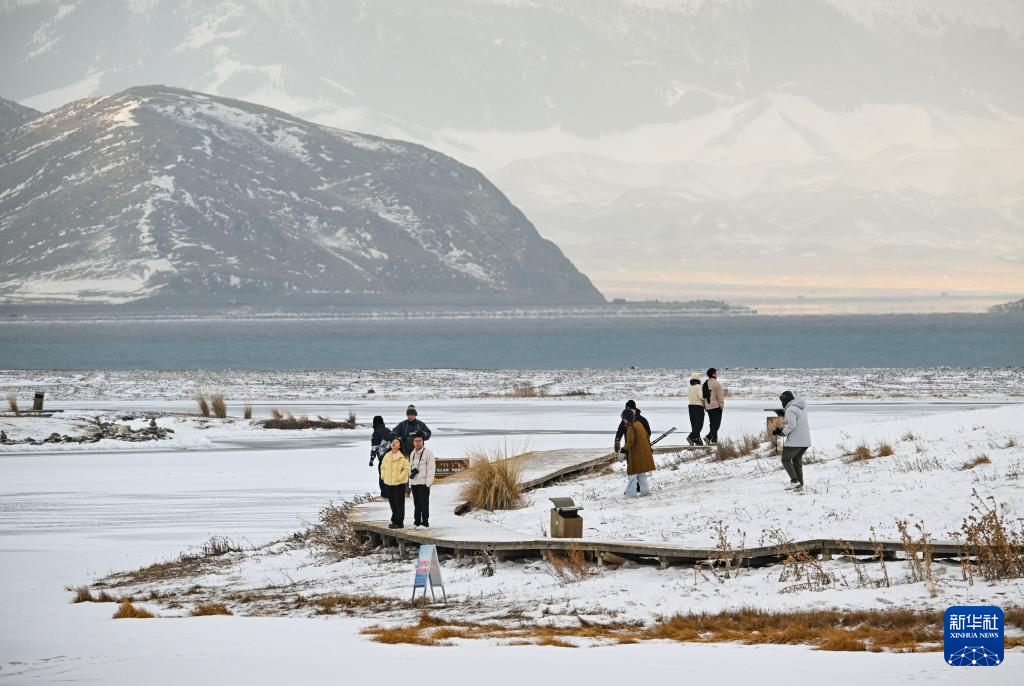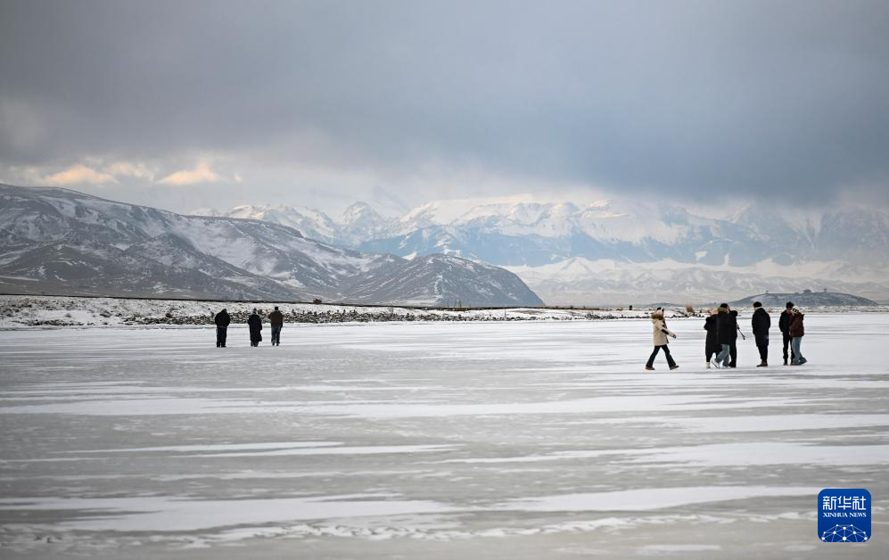 游客在赛里木湖的冰面上游玩(12月16日摄)。