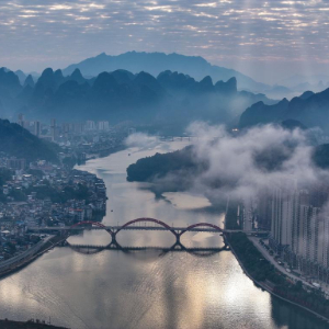 12月15日拍摄的广西平乐县城“三江口”晨曦(无人机照片)。