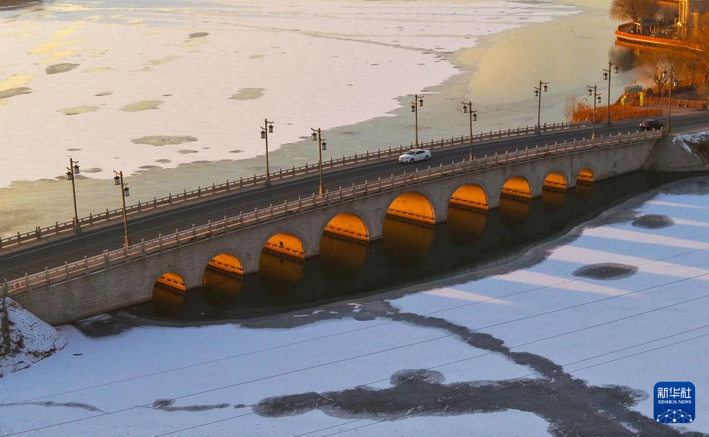 12月15日,在甘肃省张掖市甘州区滨河新区九孔桥拍摄的“金光穿洞”景观(无人机照片)。