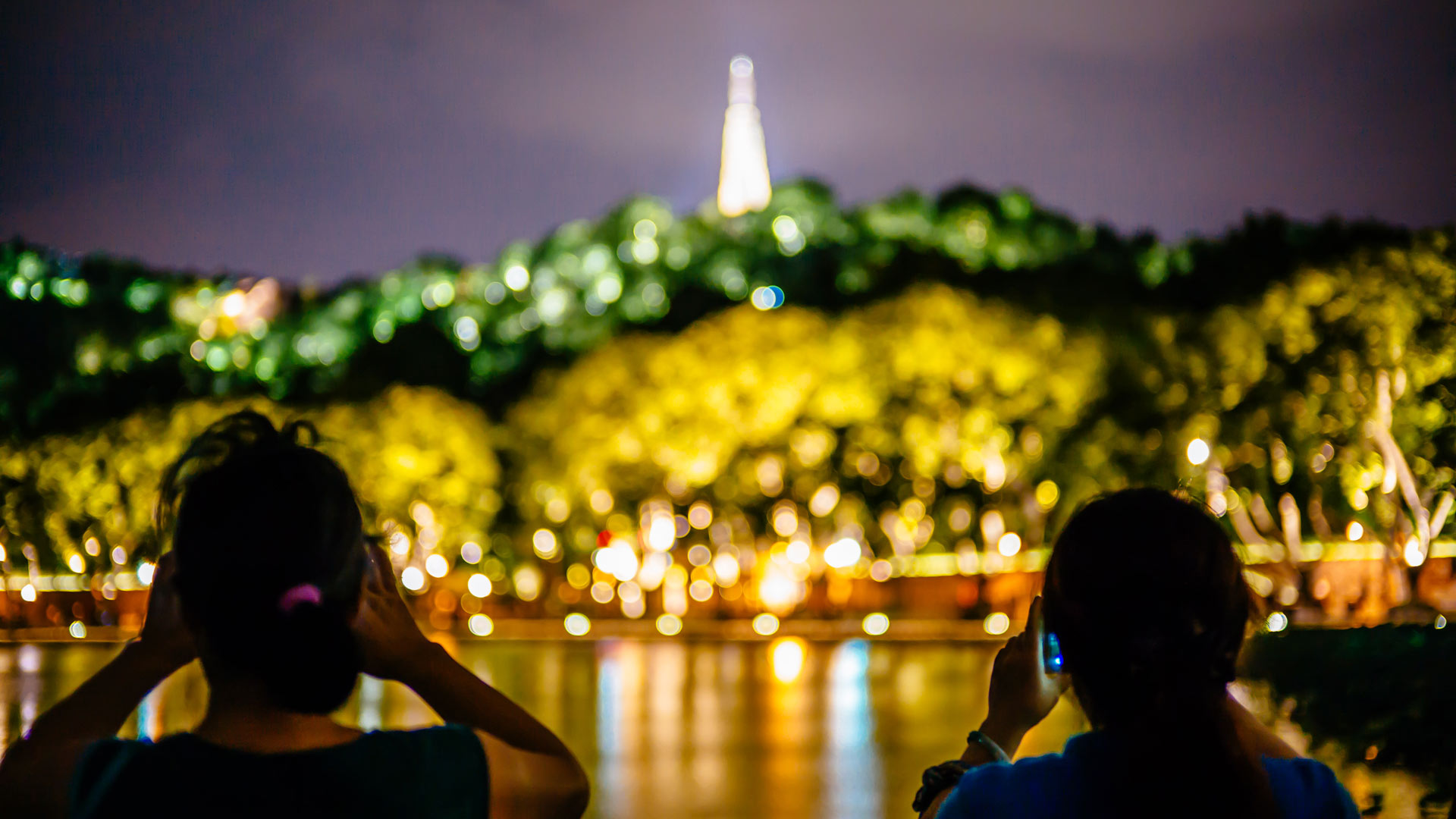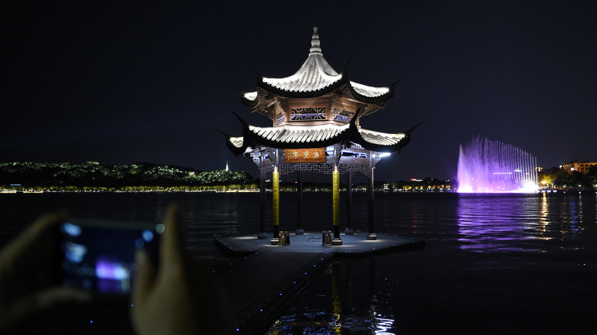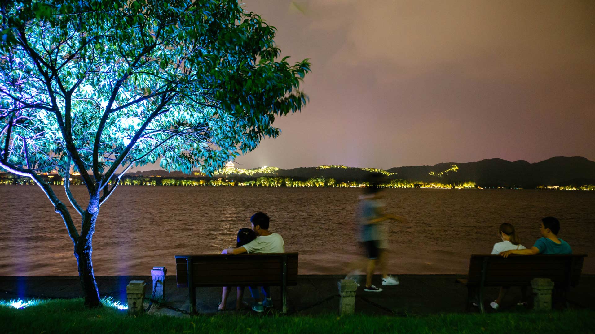 8月26日晚,市民在西子湖畔欣賞夜色。一枕錢塘江,懷擁西湖月,牽著運(yùn)河走,挽著西溪眠……到訪杭州,游人無(wú)不感嘆驚奇這座城市的美麗與優(yōu)雅。新華社記者張鋮攝