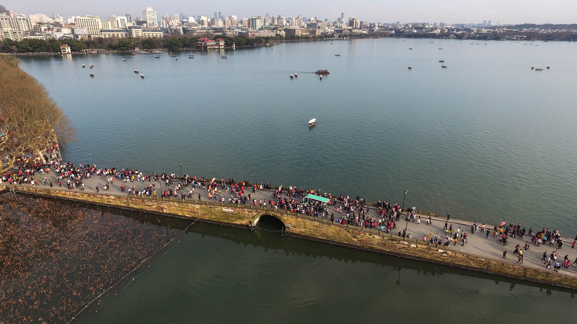 這是2月11日航拍的西湖景區(qū)斷橋。新華社記者 黃宗治 攝