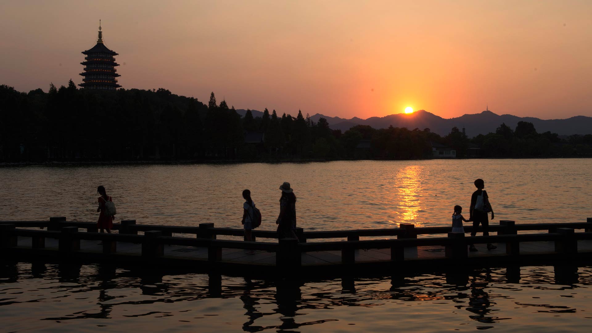 8月29日,游客在西湖邊欣賞“雷峰夕照”景觀。 新華社記者 鞠煥宗 攝