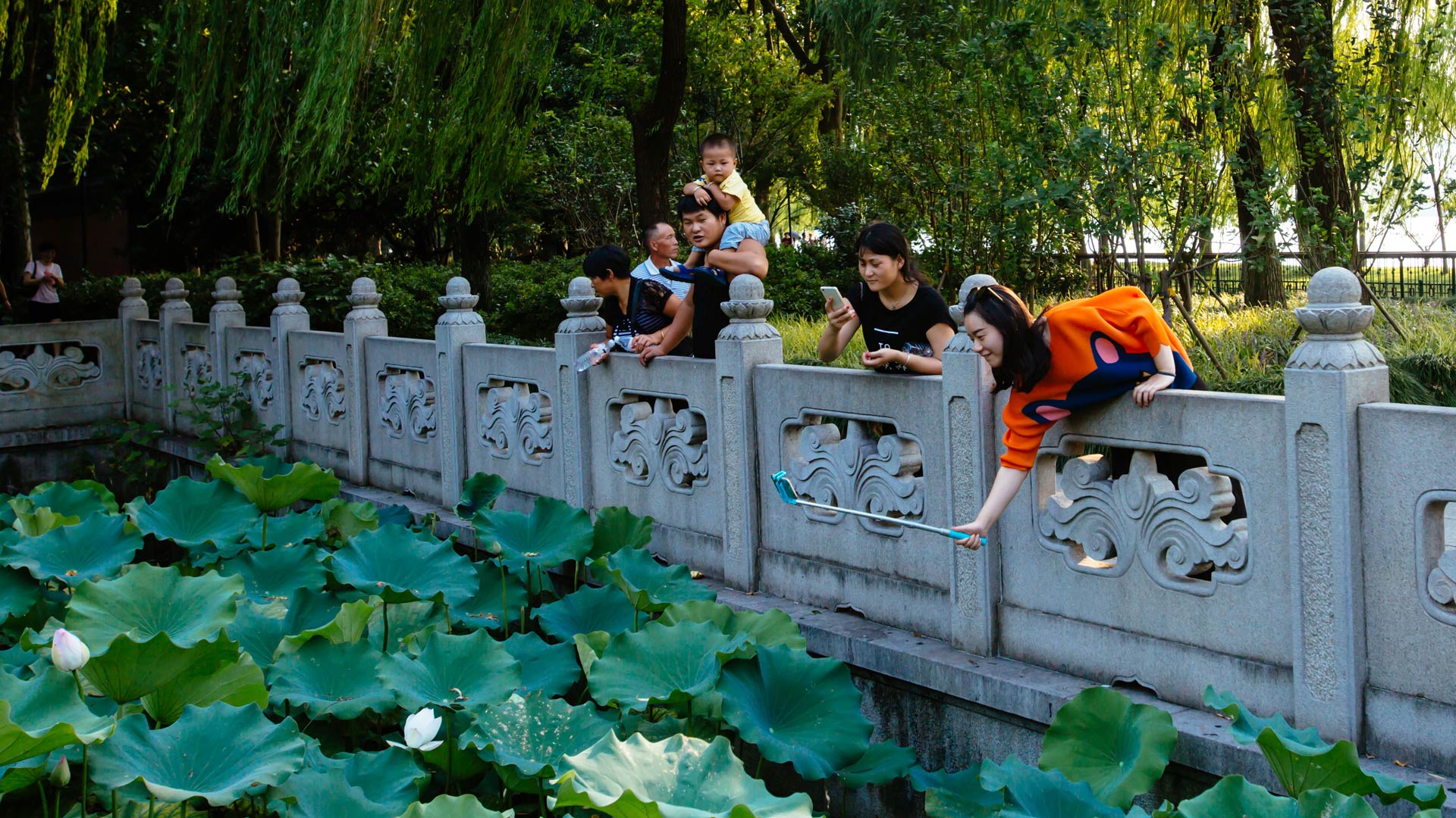 8月29日,游人在西湖一處荷塘拍攝荷花。新華社記者 張鋮 攝