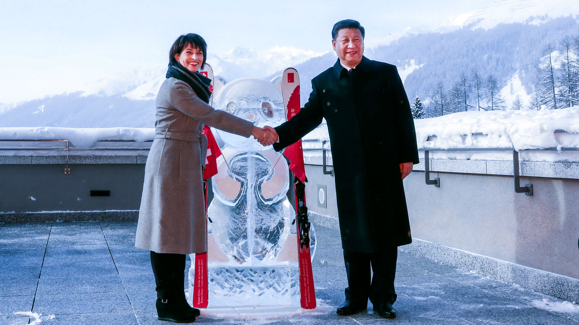 1月17日,國家主席習(xí)近平同瑞士聯(lián)邦主席洛伊特哈德在達(dá)沃斯共同啟動(dòng)中瑞旅游年。兩國元首在熊貓冰雕像和印有中瑞兩國國旗及“中瑞旅游年”字樣的滑雪板旁合影留念。新華社記者 丁林 攝2017-01-18