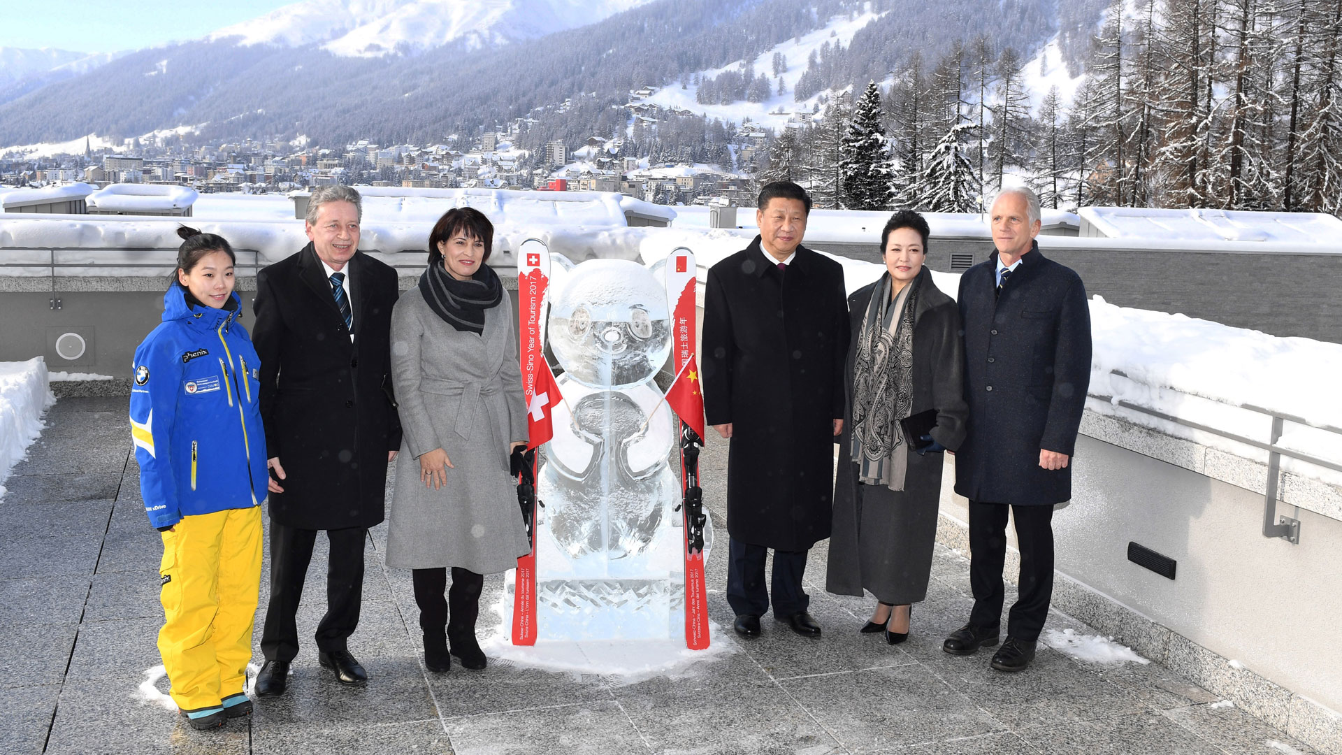 1月17日,國家主席習(xí)近平同瑞士聯(lián)邦主席洛伊特哈德在達(dá)沃斯共同啟動(dòng)中瑞旅游年。兩國元首夫婦等在熊貓冰雕像和印有中瑞兩國國旗及“中瑞旅游年”字樣的滑雪板旁合影留念。新華社記者 饒愛民 攝2017-01-18