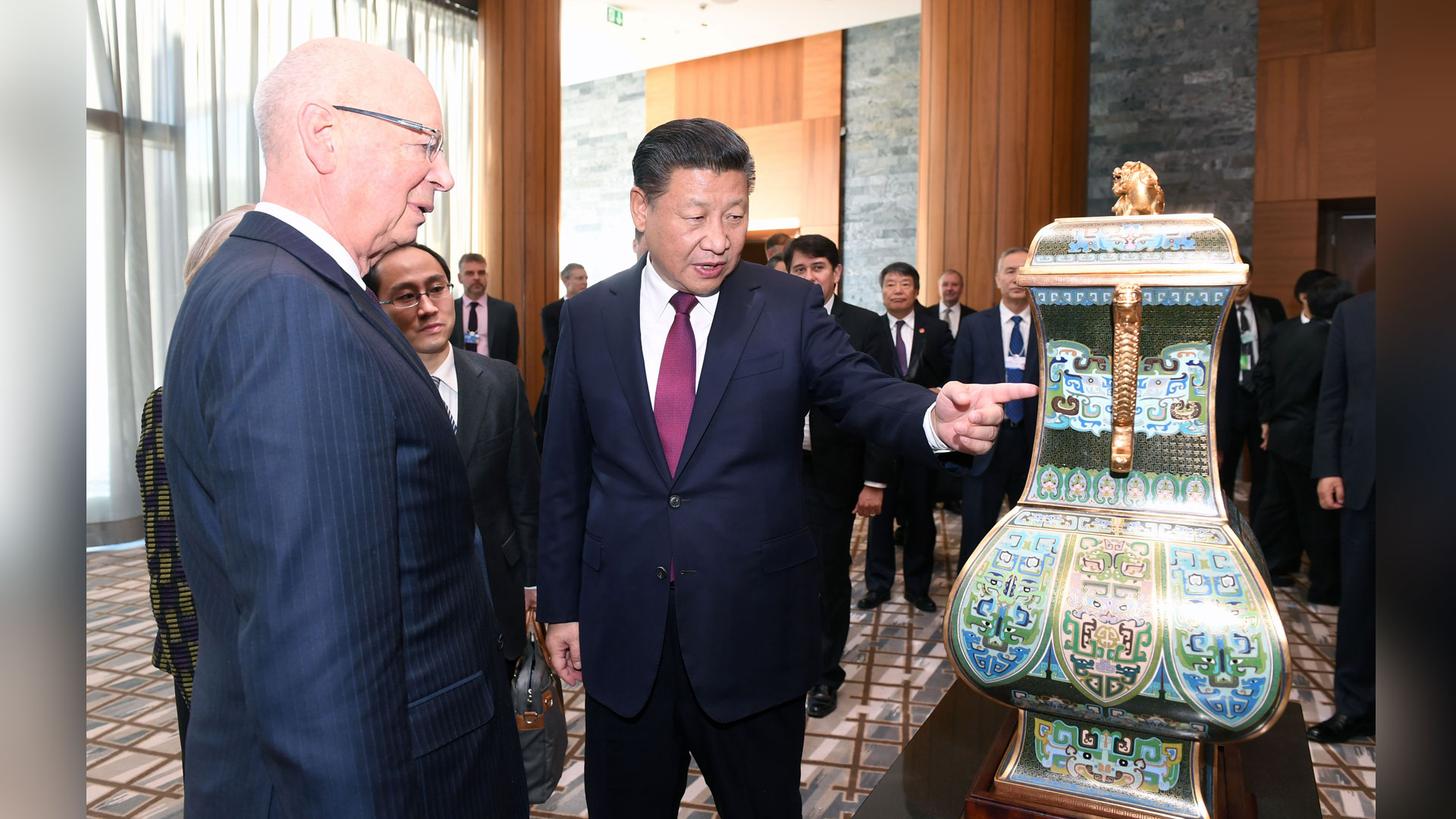 1月17日,國家主席習(xí)近平在瑞士達(dá)沃斯會(huì)見世界經(jīng)濟(jì)論壇主席施瓦布。這是習(xí)近平向施瓦布介紹中華人民共和國贈(zèng)送給世界經(jīng)濟(jì)論壇的四面方尊。新華社記者 饒愛民 攝2017-01-18