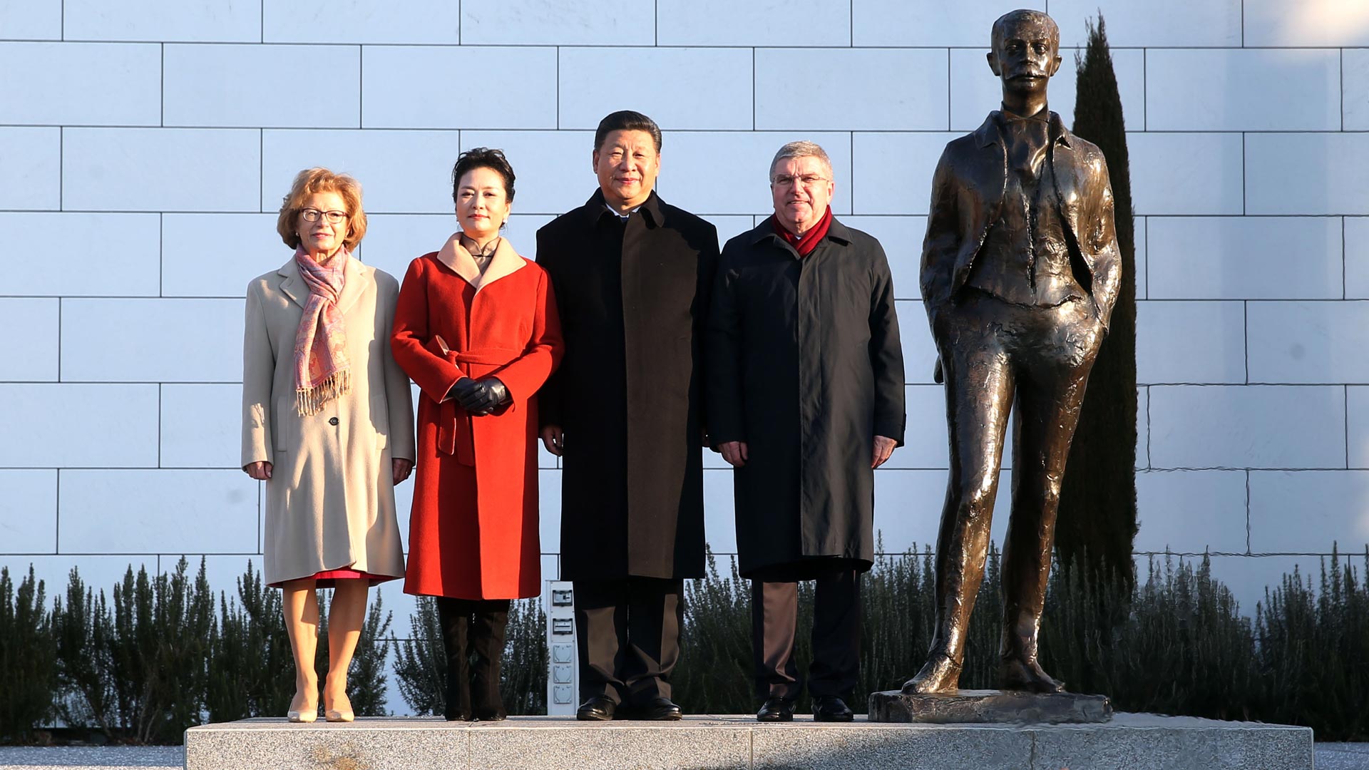 1月18日,國家主席習(xí)近平在瑞士洛桑國際奧林匹克博物館會(huì)見國際奧林匹克委員會(huì)主席巴赫。這是習(xí)近平和夫人彭麗媛與巴赫夫婦在現(xiàn)代奧林匹克運(yùn)動(dòng)發(fā)起人顧拜旦雕像前合影。新華社記者 姚大偉 攝2017-01-19