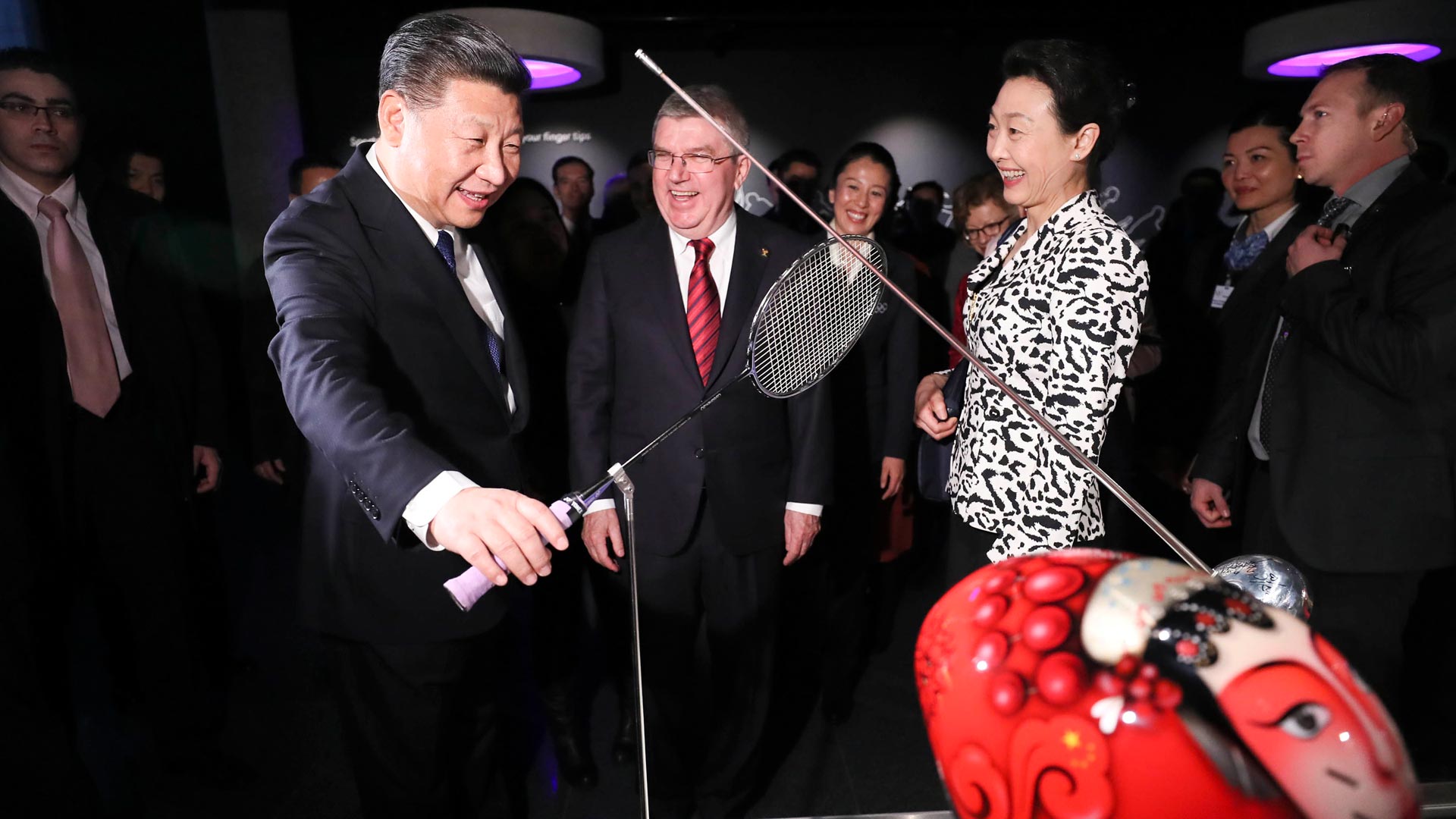 1月18日,國家主席習(xí)近平在瑞士洛桑國際奧林匹克博物館會(huì)見國際奧林匹克委員會(huì)主席巴赫。這是習(xí)近平在巴赫陪同下,參觀羽毛球世界冠軍李玲蔚用過的球拍。新華社記者 蘭紅光 攝2017-01-19