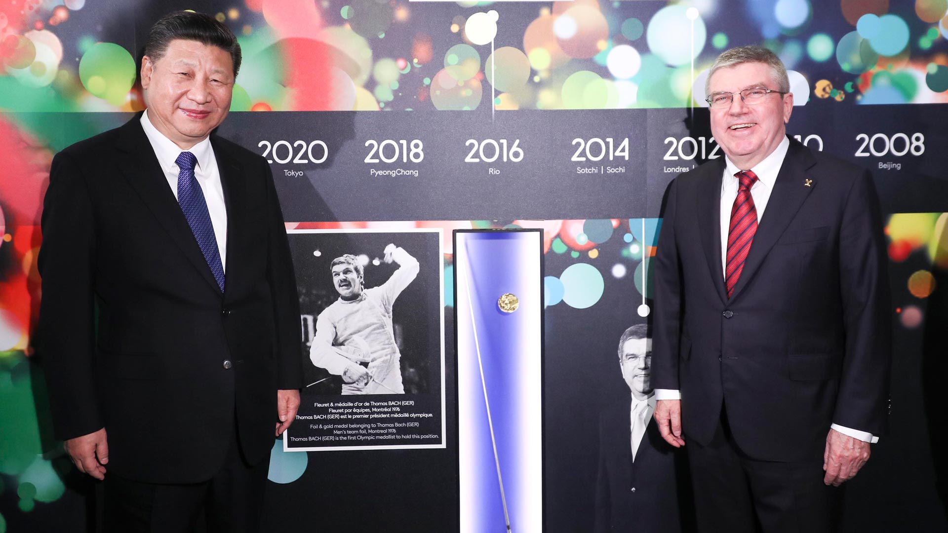 1月18日,國家主席習(xí)近平在瑞士洛桑國際奧林匹克博物館會(huì)見國際奧林匹克委員會(huì)主席巴赫。這是習(xí)近平和巴赫在奧運(yùn)冠軍領(lǐng)獎(jiǎng)臺(tái)上合影。新華社記者 蘭紅光 攝2017-01-19
